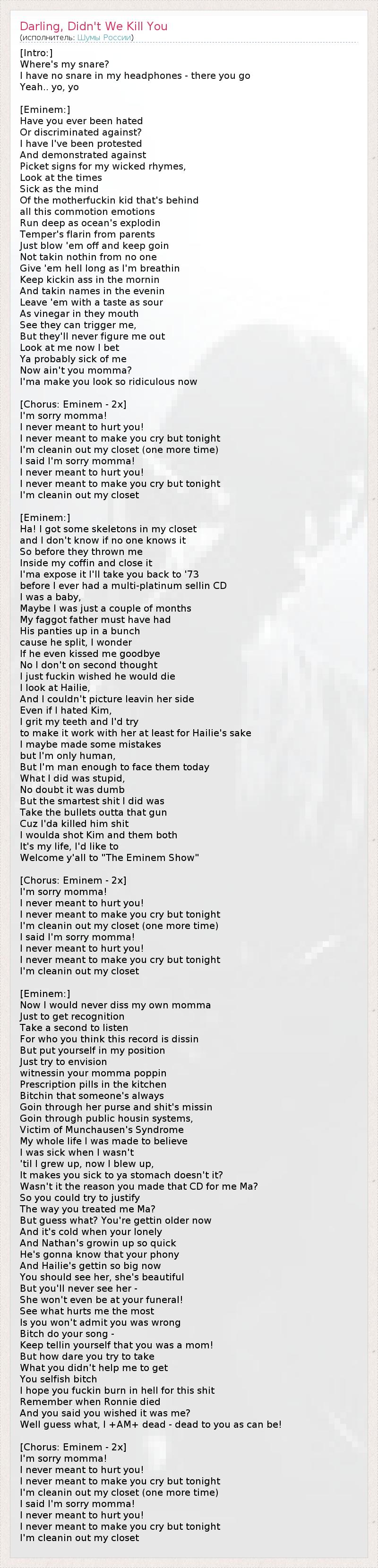 [Интро:] Где ударные? У меня в наушниках не слышно ударных. А, вот они. Да, поехали. [Куплет 1:] Тебя когда-нибудь ненавидели Или ущемляли? Меня - да, против меня протестовали И проводили демонстрации. Устравивали пикеты из-за моих ужасных текстов, Посмотри на эти времена. Сумасшедшие то как раз те, Кто поднимает этот шум-гам. Во всей этой суматохе чувства, Глубокие как океан, рвутся наружу: Родители жутко вспылыли - Просто отшей их и продолжай свой путь. Я не беру ничего ни от кого, Наоборот, всю свою жизнь я отдаю. Ухожу утром, По вечерам выслушиваю оскорбления. У них кислые лица, Будто съели что-то не то. Они могут провоцировать меня, Но никогда не поймут меня. Посмотрите на меня, могу поспорить, Вас уже тошнит от меня. Разве не так, мама? Я сейчас сделаю из тебя посмешище. [Припев: Eminem - 2x] Прости, мама. Я не хотел делать тебе больно. Я не хотел заставлять тебя плакать. Но сегодня я открою тебе тайну. Прости, мама. Я не хотел делать тебе больно. Я не хотел заставлять тебя плакать. Но сегодня я открою тебе тайну. [Куплет 2:] У меня в чулане лежат несколько скелетов, И я не знаю, догадывается ли кто-нибудь об этом. Так что до того как они положат меня В гроб и закроют его, Я разоблачу их. Я перенесу вас назад в 73-ий, Когда у меня еще не было мультиплатинового альбома. Я был младенцем, Может, мне было всего несколько месяцев. Мой педик-отец Собрал свои вещички И свалил, интересно, Поцеловал ли он меня на прощание. Хотя нет, моя следующая мысль - Это чтобы он сдох. Я смотрю на Hailie И не могу представить, что смогу ее бросить. Даже если я ненавидел Kim, Я стиснув зубы пытался Помириться с ней, хотя бы ради Hailie. Может, я наделал ошибок, Но ведь я человек, Но я мужчина и могу признать их сегодня. То, что я сделал было глупо, Без сомнения, это было тупо. Но самая умная вещь, которую я сделал - Это вытащил патроны из того пистолета. Ведь если бы я убил их, Я бы застрелил Kim и его тоже. Это моя жизнь, Добро пожаловать на шоу Эминема! [Припев: Eminem - 2x] Прости, мама. Я не хотел делать тебе больно. Я не хотел заставлять тебя плакать. Но сегодня я открою тебе тайну. Прости, мама. Я не хотел делать тебе больно. Я не хотел заставлять тебя плакать. Но сегодня я открою тебе тайну. [Куплет 3:] Я бы никогда не стал оскорблять свою маму Только чтоб получить признание. Прислушайся на секунду, если ты думаешь, Что эта запись унижает ее. Но поставь себя на мое место, Просто попытайся представить, Как твоя мама глотает Прописаные таблетки на кухне. Говорит, будто кто-то постоянно Крадет ее таблетки и деньги из кошелька, Живет в дешевой квартире, Жертва синдрома Мюнхаузена. Всю свою жизнь меня заставляли думать, Что я больной, хотя это не так, Пока я не вырос, я блеванул, И тебя от этого тошнит, не так ли? Разве не поэтому ты сделала тот диск про меня, ма? Ты смогла бы объяснить то, Как ты обращалась со мной, ма? Но знаешь что? Ты стареешь, Тебе плохо одной. И Nathan растет так быстро, Он узнает, что ты обманщица. И Hailie уже такая большая, Ты должна бы увидеть ее, она такая красивая. Но ты никогда не увидишь ее, Она даже не придет на твои похороны. Но что причиняет мне боль, так это то, Что ты никогда не признаешь, что ты неправа. С*ка, делай песню, Продолжай говорить себе, что ты была матерью. Но как ты смеешь забирать у меня то, Что ты не помогала мне получить. Ты эгоистичная с*ка, Надеюсь, ты будешь гореть в аду за это дер*мо. Помнишь, когда Ronnie у