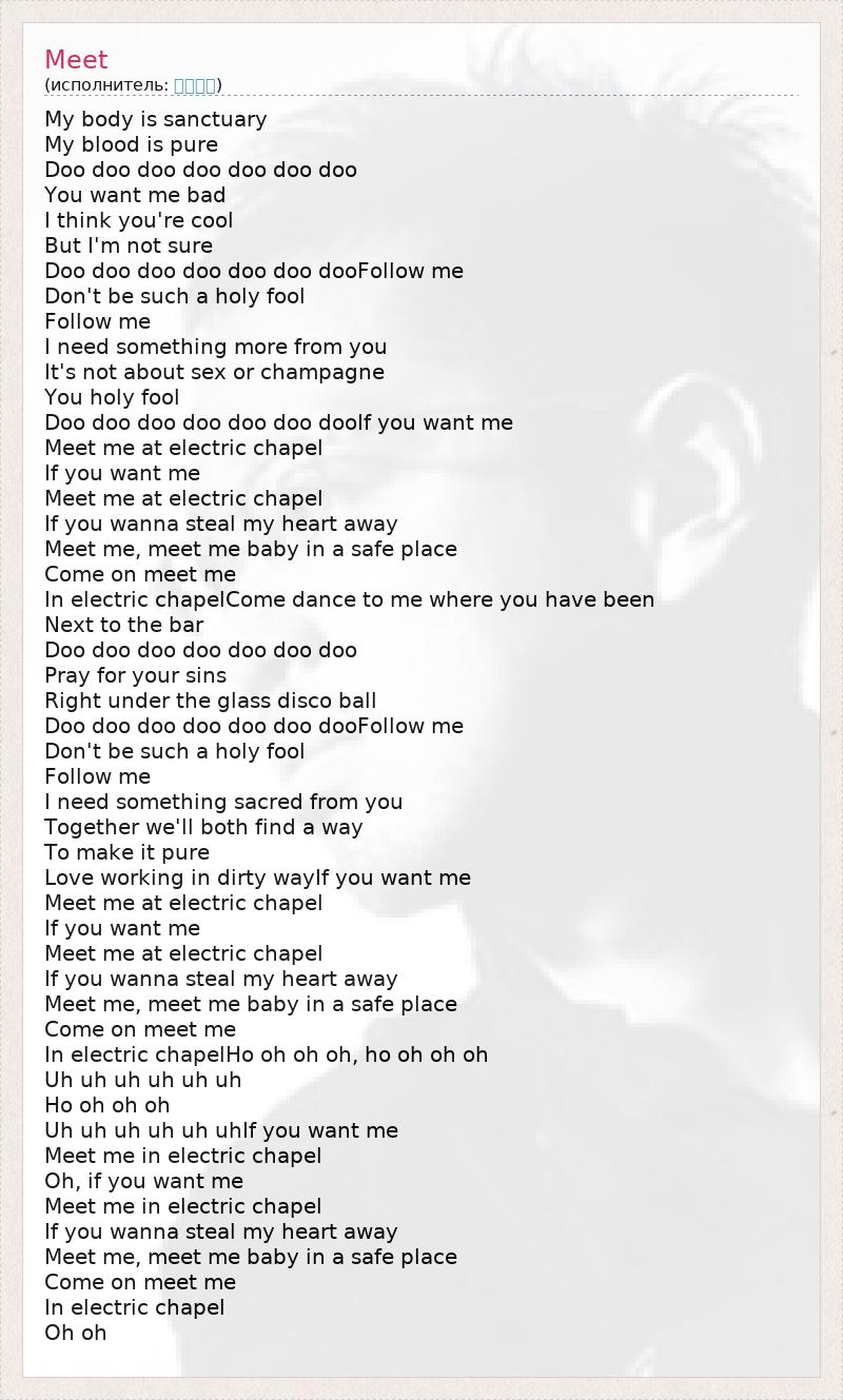 My body is sanctuary My blood is pure Doo doo doo doo doo doo doo You want me bad I think you're cool But I'm not sure Doo doo doo doo doo doo dooFollow me Don't be such a holy fool Follow me I need something more from you It's not about sex or champagne You holy fool Doo doo doo doo doo doo dooIf you want me Meet me at electric chapel If you want me Meet me at electric chapel If you wanna steal my heart away Meet me, meet me baby in a safe place Come on meet me In electric chapelCome dance to me where you have been Next to the bar Doo doo doo doo doo doo doo Pray for your sins Right under the glass disco ball Doo doo doo doo doo doo dooFollow me Don't be such a holy fool Follow me I need something sacred from you Together we'll both find a way To make it pure Love working in dirty wayIf you want me Meet me at electric chapel If you want me Meet me at electric chapel If you wanna steal my heart away Meet me, meet me baby in a safe place Come on meet me In electric chapelHo oh oh oh, ho oh oh oh Uh uh uh uh uh uh Ho oh oh oh Uh uh uh uh uh uhIf you want me Meet me in electric chapel Oh, if you want me Meet me in electric chapel If you wanna steal my heart away Meet me, meet me baby in a safe place Come on meet me In electric chapel Oh oh