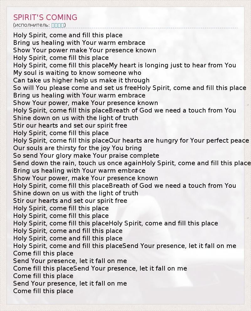 Holy Spirit, come and fill this place Bring us healing with Your warm embrace Show Your power make Your presence known Holy Spirit, come fill this place Holy Spirit, come fill this placeMy heart is longing just to hear from You My soul is waiting to know someone who Can take us higher help us make it through So will You please come and set us freeHoly Spirit, come and fill this place Bring us healing with Your warm embrace Show Your power, make Your presence known Holy Spirit, come fill this placeBreath of God we need a touch from You Shine down on us with the light of truth Stir our hearts and set our spirit free Holy Spirit, come fill this place Holy Spirit, come fill this placeOur hearts are hungry for Your perfect peace Our souls are thirsty for the joy You bring So send Your glory make Your praise complete Send down the rain, touch us once againHoly Spirit, come and fill this place Bring us healing with Your warm embrace Show Your power, make Your presence known Holy Spirit, come fill this placeBreath of God we need a touch from You Shine down on us with the light of truth Stir our hearts and set our spirit free Holy Spirit, come fill this place Holy Spirit, come fill this place Holy Spirit, come fill this placeHoly Spirit, come and fill this place Holy Spirit, come and fill this place Holy Spirit, come and fill this place Holy Spirit, come and fill this placeSend Your presence, let it fall on me Come fill this place Send Your presence, let it fall on me Come fill this placeSend Your presence, let it fall on me Come fill this place Send Your presence, let it fall on me Come fill this place