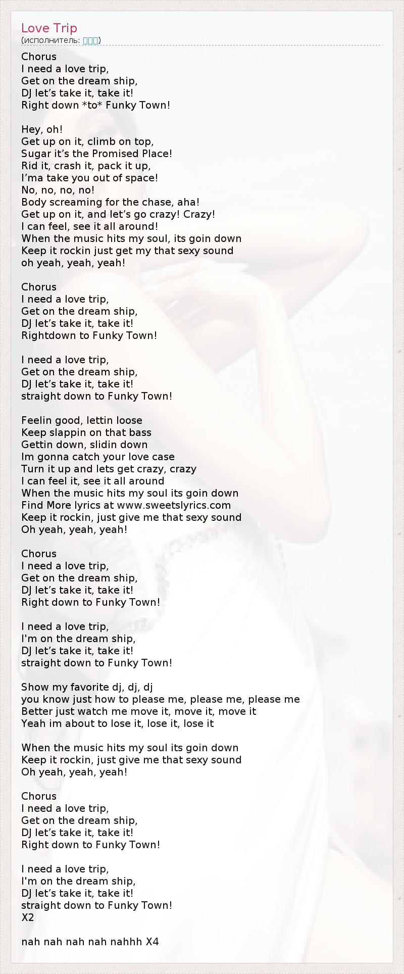Chorus I need a love trip, Get on the dream ship, DJ let’s take it, take it! Right down *to* Funky Town! Hey, oh! Get up on it, climb on top, Sugar it’s the Promised Place! Rid it, crash it, pack it up, I’ma take you out of space! No, no, no, no! Body screaming for the chase, aha! Get up on it, and let’s go crazy! Crazy! I can feel, see it all around! When the music hits my soul, its goin down Keep it rockin just get my that sexy sound oh yeah, yeah, yeah! Chorus I need a love trip, Get on the dream ship, DJ let’s take it, take it! Rightdown to Funky Town! I need a love trip, Get on the dream ship, DJ let’s take it, take it! straight down to Funky Town! Feelin good, lettin loose Keep slappin on that bass Gettin down, slidin down Im gonna catch your love case Turn it up and lets get crazy, crazy I can feel it, see it all around When the music hits my soul its goin down Find More lyrics at www.sweetslyrics.com Keep it rockin, just give me that sexy sound Oh yeah, yeah, yeah! Chorus I need a love trip, Get on the dream ship, DJ let’s take it, take it! Right down to Funky Town! I need a love trip, I'm on the dream ship, DJ let’s take it, take it! straight down to Funky Town! Show my favorite dj, dj, dj you know just how to please me, please me, please me Better just watch me move it, move it, move it Yeah im about to lose it, lose it, lose it When the music hits my soul its goin down Keep it rockin, just give me that sexy sound Oh yeah, yeah, yeah! Chorus I need a love trip, Get on the dream ship, DJ let’s take it, take it! Right down to Funky Town! I need a love trip, I'm on the dream ship, DJ let’s take it, take it! straight down to Funky Town! X2 nah nah nah nah nahhh X4