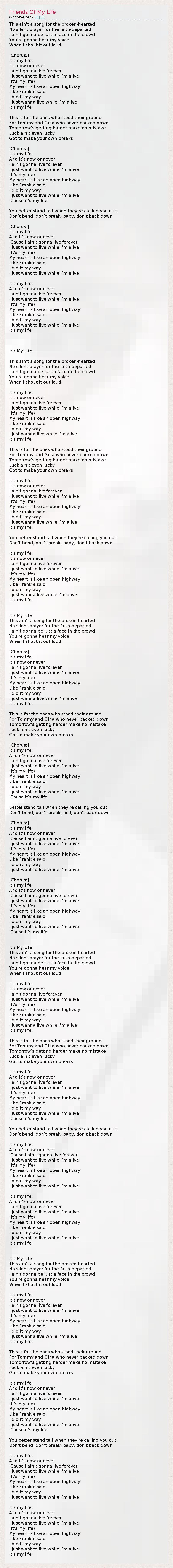 This ain't a song for the broken-hearted No silent prayer for the faith-departed I ain't gonna be just a face in the crowd You're gonna hear my voice When I shout it out loud [Chorus:] It's my life It's now or never I ain't gonna live forever I just want to live while I'm alive (It's my life) My heart is like an open highway Like Frankie said I did it my way I just wanna live while I'm alive It's my life This is for the ones who stood their ground For Tommy and Gina who never backed down Tomorrow's getting harder make no mistake Luck ain't even lucky Got to make your own breaks [Chorus:] It's my life And it's now or never I ain't gonna live forever I just want to live while I'm alive (It's my life) My heart is like an open highway Like Frankie said I did it my way I just want to live while I'm alive 'Cause it's my life You better stand tall when they're calling you out Don't bend, don't break, baby, don't back down [Chorus:] It's my life And it's now or never 'Cause I ain't gonna live forever I just want to live while I'm alive (It's my life) My heart is like an open highway Like Frankie said I did it my way I just want to live while I'm alive It's my life And it's now or never I ain't gonna live forever I just want to live while I'm alive (It's my life) My heart is like an open highway Like Frankie said I did it my way I just want to live while I'm alive It's my life It's My Life This ain't a song for the broken-hearted No silent prayer for the faith-departed I ain't gonna be just a face in the crowd You're gonna hear my voice When I shout it out loud It's my life It's now or never I ain't gonna live forever I just want to live while I'm alive (It's my life) My heart is like an open highway Like Frankie said I did it my way I just wanna live while I'm alive It's my life This is for the ones who stood their ground For Tommy and Gina who never backed down Tomorrow's getting harder make no mistake Luck ain't even lucky Got to make your own breaks It's my life It's now or never I ain't gonna live forever I just want to live while I'm alive (It's my life) My heart is like an open highway Like Frankie said I did it my way I just wanna live while I'm alive It's my life You better stand tall when they're calling you out Don't bend, don't break, baby, don't back down It's my life It's now or never I ain't gonna live forever I just want to live while I'm alive (It's my life) My heart is like an open highway Like Frankie said I did it my way I just wanna live while I'm alive It's my life It's My Life This ain't a song for the broken-hearted No silent prayer for the faith-departed I ain't gonna be just a face in the crowd You're gonna hear my voice When I shout it out loud [Chorus:] It's my life It's now or never I ain't gonna live forever I just want to live while I'm alive (It's my life) My heart is like an open highway Like Frankie said I did it my way I just wanna live while I'm alive It's my life This is for the ones who stood their ground For Tommy and Gina who never backed down Tomorrow's getting harder make no mistake Luck ain't even lucky Got to make your own breaks [Chorus:] It's my life And it's now or never I ain't gonna live forever I just want to live while I'm alive (It's my life) My heart is like an open highway Like Frankie said I did it my way I just want to live while I'm alive 'Cause it's my life Better stand tall when they're calling you out Don't bend, don't break, hell, don't back down [Chorus:] It's my life And it's now or never 'Cause I ain't gonna live forever I just want to live while I'm alive (It's my life) My heart is like an open highway Like Frankie said I did it my way I just want to live while I'm alive [Chorus:] It's my life And it's now or never 'Cause I ain't gonna live forever I just want to live while I'm alive (It's my life) My heart is like an open highway Like Frankie said I did it my way I just want to live while I'm alive 'Cause it's my life It's My Life This ain't a song for the broken-hearted No silent prayer for the faith-departed I ain't gonna be just a face in the crowd You're gonna hear my voice When I shout it out loud It's my life It's now or never I ain't gonna live forever I just want to live while I'm alive (It's my life) My heart is like an open highway Like Frankie said I did it my way I just wanna live while I'm alive It's my life This is for the ones who stood their ground For Tommy and Gina who never backed down Tomorrow's getting harder make no mistake Luck ain't even lucky Got to make your own breaks It's my life And it's now or never I ain't gonna live forever I just want to live while I'm alive (It's my life) My heart is like an open highway Like Frankie said I did it my way I just want to live while I'm alive 'Cause it's my life You better stand tall when they're calling you out Don't bend, don't break, baby, don't back down It's my life And it's now or never 'Cause I ain't gonna live forever I just want to live while I'm alive (It's my life) My heart is like an open highway Like Frankie said I did it my way I just want to live while I'm alive It's my life And it's now or never I ain't gonna live forever I just want to live while I'm alive (It's my life) My heart is like an open highway Like Frankie said I did it my way I just want to live while I'm alive It's my life It's My Life This ain't a song for the broken-hearted No silent prayer for the faith-departed I ain't gonna be just a face in the crowd You're gonna hear my voice When I shout it out loud It's my life It's now or never I ain't gonna live forever I just want to live while I'm alive (It's my life) My heart is like an open highway Like Frankie said I did it my way I just wanna live while I'm alive It's my life This is for the ones who stood their ground For Tommy and Gina who never backed down Tomorrow's getting harder make no mistake Luck ain't even lucky Got to make your own breaks It's my life And it's now or never I ain't gonna live forever I just want to live while I'm
