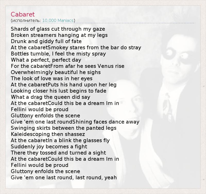 Это интересно:10,000 Мэниакс (10,000 Maniacs) - американская группа 1980-х годов. Впервые появилась в городе Джеймстаун (штат Нью-Йорк) в 1981 в составе: Натали Мерчент (вокал), Джером Огастиньяк (барабаны), Роберт Бак (гитара), Деннис Дрю (клавишные) и Стивен Густафсон (бас). Музыканты играли кавер-версии песен таких групп, как JOY DIVISION и GANG OF FOUR. В сентябре 1993 Натали Мерчент начала свою сольную карьеру.Дискография:HOPE... продолжение