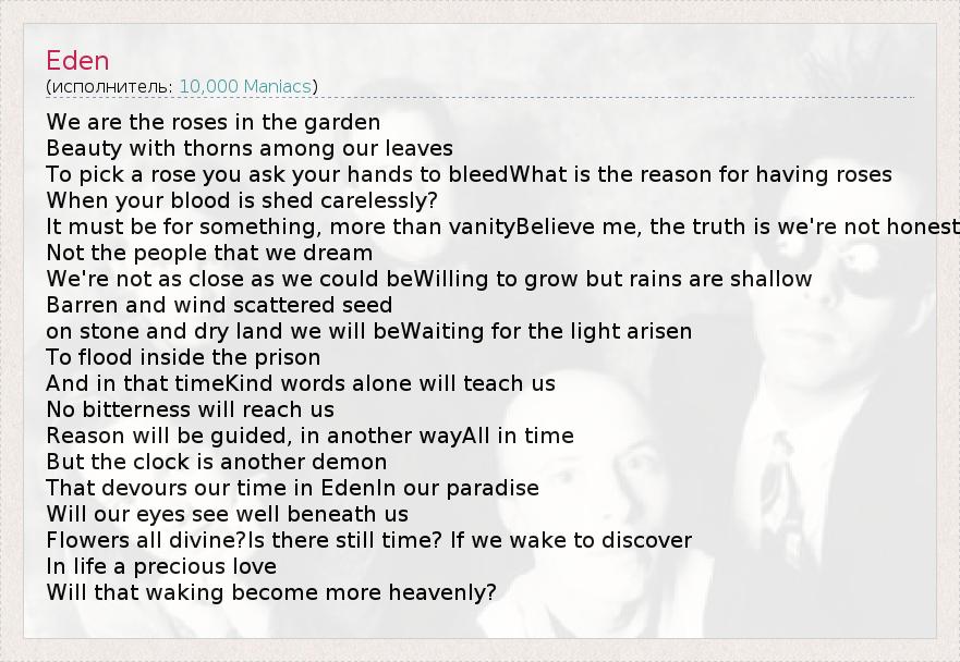 Это интересно:10,000 Мэниакс (10,000 Maniacs) - американская группа 1980-х годов. Впервые появилась в городе Джеймстаун (штат Нью-Йорк) в 1981 в составе: Натали Мерчент (вокал), Джером Огастиньяк (барабаны), Роберт Бак (гитара), Деннис Дрю (клавишные) и Стивен Густафсон (бас). Музыканты играли кавер-версии песен таких групп, как JOY DIVISION и GANG OF FOUR. В сентябре 1993 Натали Мерчент начала свою сольную карьеру.Дискография:HOPE... продолжение