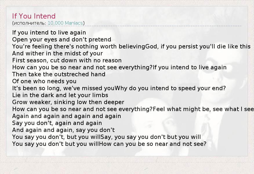 Это интересно:10,000 Мэниакс (10,000 Maniacs) - американская группа 1980-х годов. Впервые появилась в городе Джеймстаун (штат Нью-Йорк) в 1981 в составе: Натали Мерчент (вокал), Джером Огастиньяк (барабаны), Роберт Бак (гитара), Деннис Дрю (клавишные) и Стивен Густафсон (бас). Музыканты играли кавер-версии песен таких групп, как JOY DIVISION и GANG OF FOUR. В сентябре 1993 Натали Мерчент начала свою сольную карьеру.Дискография:HOPE... продолжение