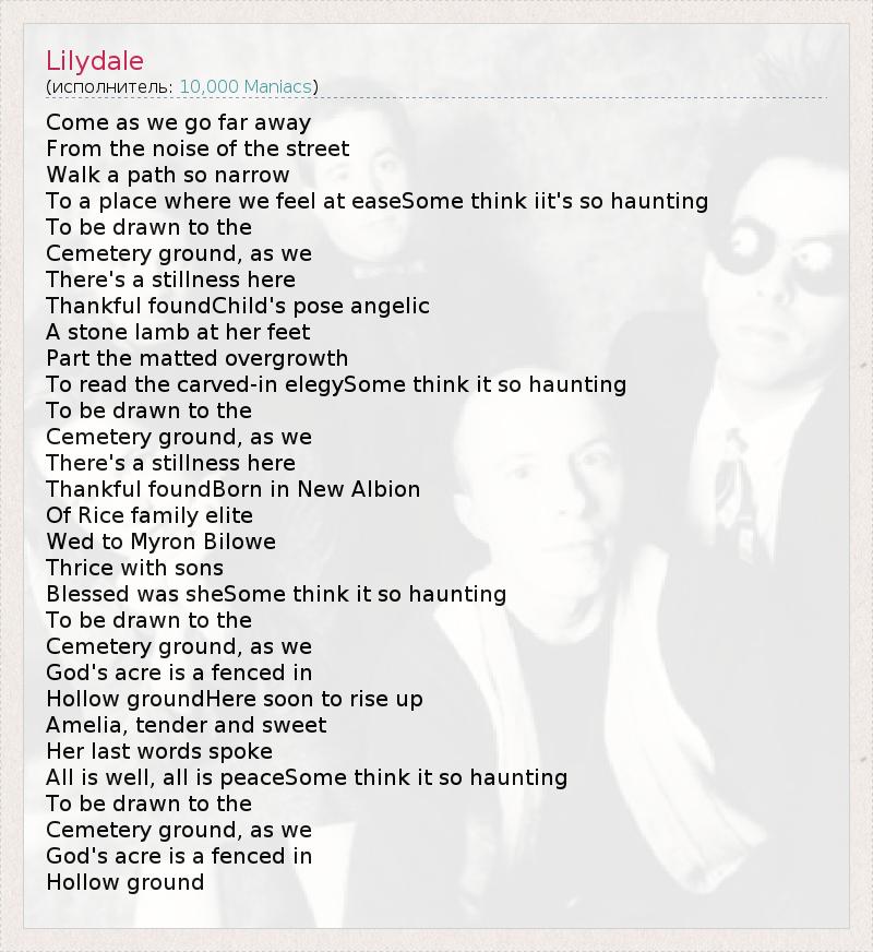 Come as we go far away From the noise of the street Walk a path so narrow To a place where we feel at easeSome think iit's so haunting To be drawn to the Cemetery ground, as we There's a stillness here Thankful foundChild's pose angelic A stone lamb at her feet Part the matted overgrowth To read the carved-in elegySome think it so haunting To be drawn to the Cemetery ground, as we There's a stillness here Thankful foundBorn in New Albion Of Rice family elite Wed to Myron Bilowe Thrice with sons Blessed was sheSome think it so haunting To be drawn to the Cemetery ground, as we God's acre is a fenced in Hollow groundHere soon to rise up Amelia, tender and sweet Her last words spoke All is well, all is peaceSome think it so haunting To be drawn to the Cemetery ground, as we God's acre is a fenced in Hollow ground