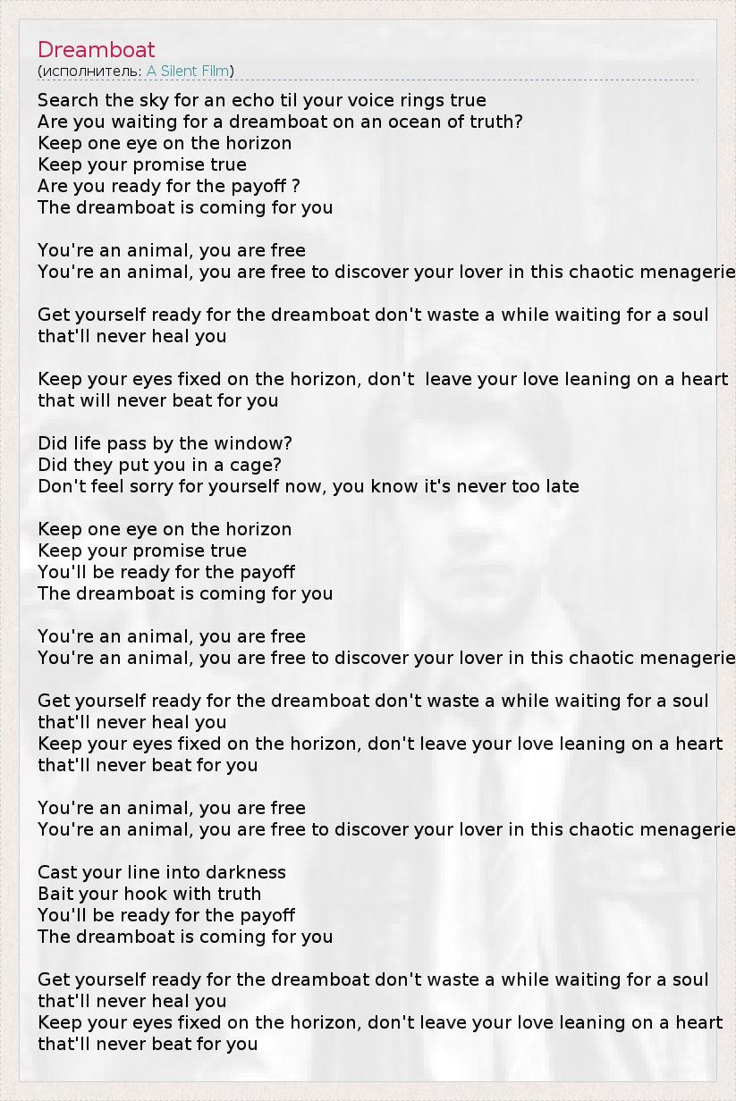 Search the sky for an echo til your voice rings true Are you waiting for a dreamboat on an ocean of truth? Keep one eye on the horizon Keep your promise true Are you ready for the payoff ? The dreamboat is coming for you You're an animal, you are free You're an animal, you are free to discover your lover in this chaotic menagerie Get yourself ready for the dreamboat don't waste a while waiting for a soul that'll never heal you Keep your eyes fixed on the horizon, don't leave your love leaning on a heart that will never beat for you Did life pass by the window? Did they put you in a cage? Don't feel sorry for yourself now, you know it's never too late Keep one eye on the horizon Keep your promise true You'll be ready for the payoff The dreamboat is coming for you You're an animal, you are free You're an animal, you are free to discover your lover in this chaotic menagerie Get yourself ready for the dreamboat don't waste a while waiting for a soul that'll never heal you Keep your eyes fixed on the horizon, don't leave your love leaning on a heart that'll never beat for you You're an animal, you are free You're an animal, you are free to discover your lover in this chaotic menagerie Cast your line into darkness Bait your hook with truth You'll be ready for the payoff The dreamboat is coming for you Get yourself ready for the dreamboat don't waste a while waiting for a soul that'll never heal you Keep your eyes fixed on the horizon, don't leave your love leaning on a heart that'll never beat for you