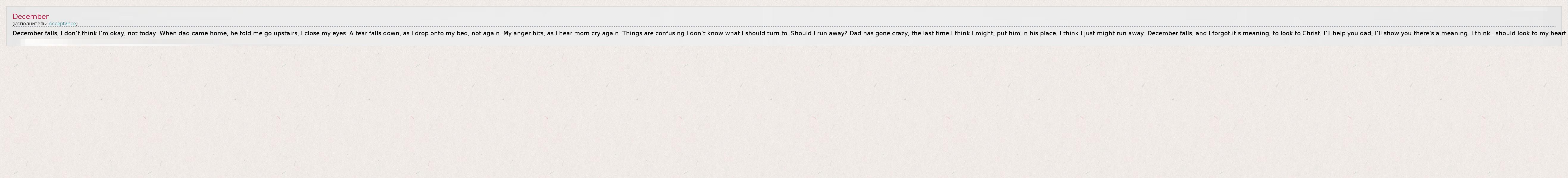 December falls, I don't think I'm okay, not today. When dad came home, he told me go upstairs, I close my eyes. A tear falls down, as I drop onto my bed, not again. My anger hits, as I hear mom cry again. Things are confusing I don't know what I should turn to. Should I run away? Dad has gone crazy, the last time I think I might, put him in his place. I think I just might run away. December falls, and I forgot it's meaning, to look to Christ. I'll help you dad, I'll show you there's a meaning. I think I should look to my heart.