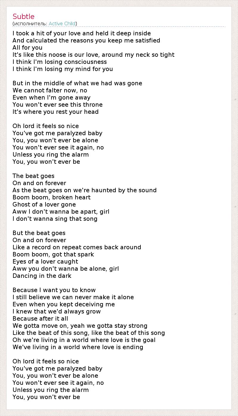 I took a hit of your love and held it deep inside And calculated the reasons you keep me satisfied All for you It's like this noose is our love, around my neck so tight I think I'm losing consciousness I think I'm losing my mind for you But in the middle of what we had was gone We cannot falter now, no Even when I'm gone away You won't ever see this throne It's where you rest your head Oh lord it feels so nice You've got me paralyzed baby You, you won't ever be alone You won't ever see it again, no Unless you ring the alarm You, you won't ever be The beat goes On and on forever As the beat goes on we're haunted by the sound Boom boom, broken heart Ghost of a lover gone Aww I don't wanna be apart, girl I don't wanna sing that song But the beat goes On and on forever Like a record on repeat comes back around Boom boom, got that spark Eyes of a lover caught Aww you don't wanna be alone, girl Dancing in the dark Because I want you to know I still believe we can never make it alone Even when you kept deceiving me I knew that we'd always grow Because after it all We gotta move on, yeah we gotta stay strong Like the beat of this song, like the beat of this song Oh we're living in a world where love is the goal We've living in a world where love is ending Oh lord it feels so nice You've got me paralyzed baby You, you won't ever be alone You won't ever see it again, no Unless you ring the alarm You, you won't ever be