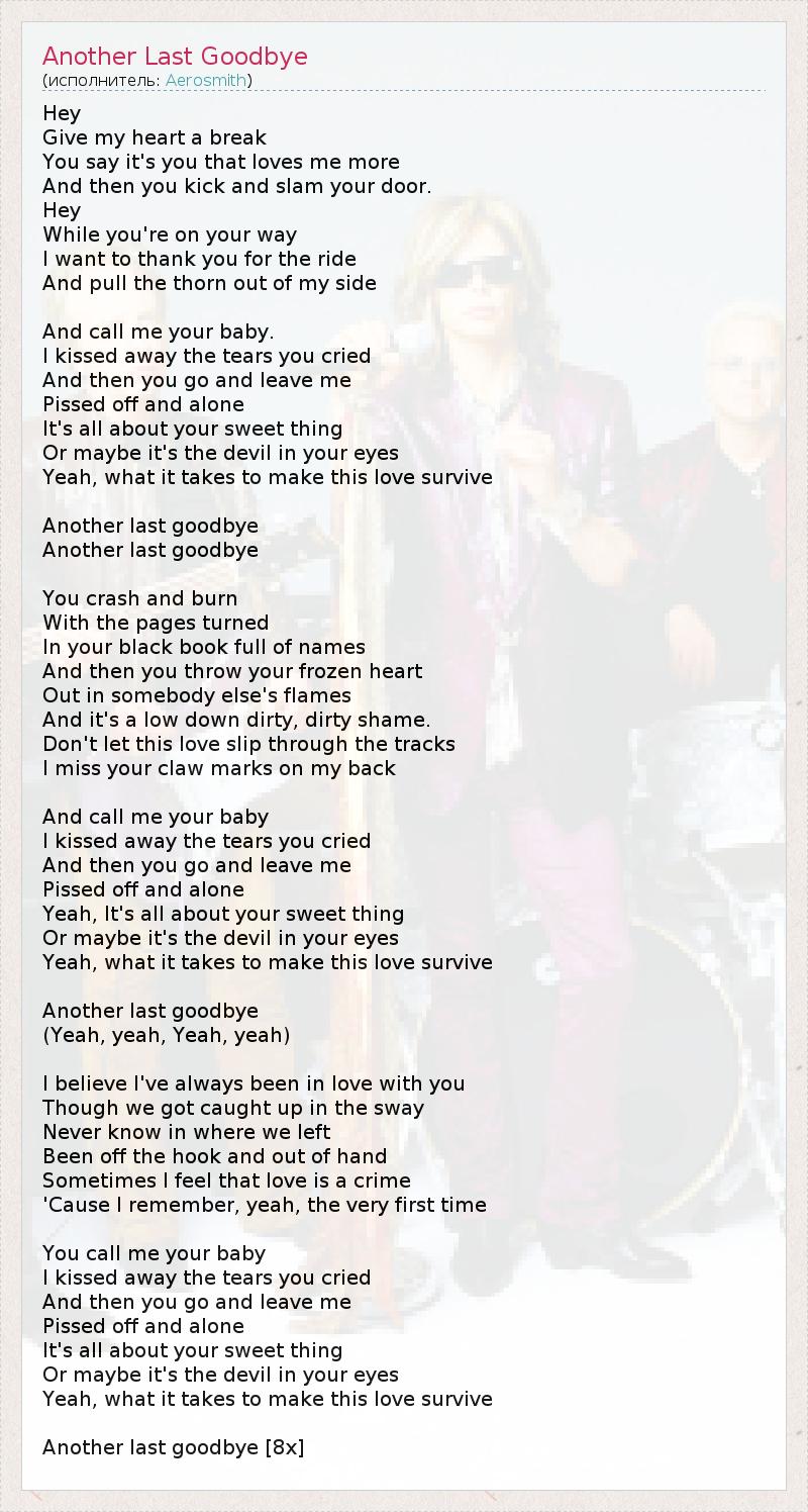 Hey Give my heart a break You say it's you that loves me more And then you kick and slam your door. Hey While you're on your way I want to thank you for the ride And pull the thorn out of my side And call me your baby. I kissed away the tears you cried And then you go and leave me Pissed off and alone It's all about your sweet thing Or maybe it's the devil in your eyes Yeah, what it takes to make this love survive Another last goodbye Another last goodbye You crash and burn With the pages turned In your black book full of names And then you throw your frozen heart Out in somebody else's flames And it's a low down dirty, dirty shame. Don't let this love slip through the tracks I miss your claw marks on my back And call me your baby I kissed away the tears you cried And then you go and leave me Pissed off and alone Yeah, It's all about your sweet thing Or maybe it's the devil in your eyes Yeah, what it takes to make this love survive Another last goodbye (Yeah, yeah, Yeah, yeah) I believe I've always been in love with you Though we got caught up in the sway Never know in where we left Been off the hook and out of hand Sometimes I feel that love is a crime 'Cause I remember, yeah, the very first time You call me your baby I kissed away the tears you cried And then you go and leave me Pissed off and alone It's all about your sweet thing Or maybe it's the devil in your eyes Yeah, what it takes to make this love survive Another last goodbye [8x]