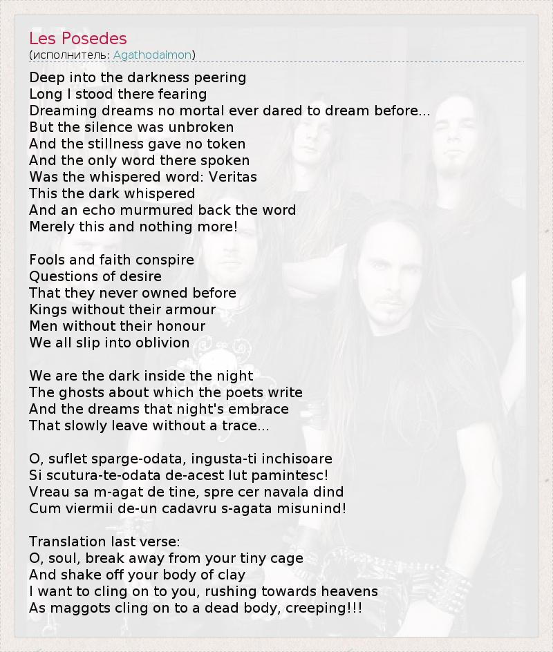 Это интересно:Agathodaimon (греч. "добрый дух") - мистический персонаж, часто упоминаемый в древних александрийских свитках разными авторами, в частности Hermes Trismegistos, часто идентифицируется с Сэтом, сыном Адама. Но никто не знает лучше, что такое Agathodaimon, чем душа группы, гитарист и менеджер Сатонис: "Это название греческого происхождения. Agathodaimon - это своего рода загадка, загадка, основанная на числах... продолжение
