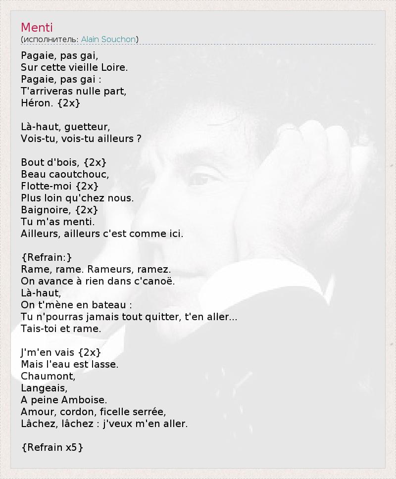 Это интересно:Ален Сушон (Ален Кинаст Alain Kienast) появился на свет в Касабланке (Марокко) 27 мая 1944 года в семье преподавателя английского языка. Вскоре семья переехала в Париж, где и прошло детство Алена. В начале 60х юноша некоторое время жил в Лондоне, а по возвращении в Париж начал писать песни и выступать в кафе и барах артистического квартала столицы - на Левом Берегу Сены. В 1971 году Сушон заключил контракт... продолжение