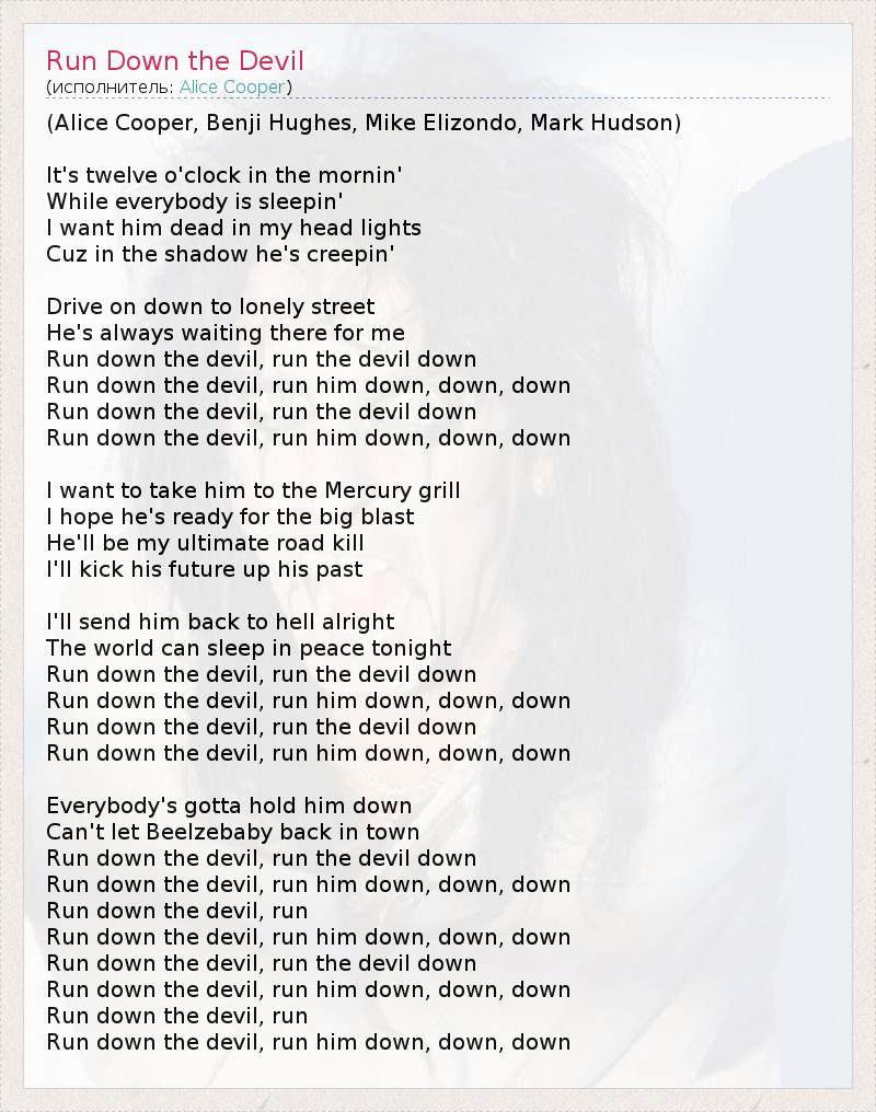 (Alice Cooper, Benji Hughes, Mike Elizondo, Mark Hudson) It's twelve o'clock in the mornin' While everybody is sleepin' I want him dead in my head lights Cuz in the shadow he's creepin' Drive on down to lonely street He's always waiting there for me Run down the devil, run the devil down Run down the devil, run him down, down, down Run down the devil, run the devil down Run down the devil, run him down, down, down I want to take him to the Mercury grill I hope he's ready for the big blast He'll be my ultimate road kill I'll kick his future up his past I'll send him back to hell alright The world can sleep in peace tonight Run down the devil, run the devil down Run down the devil, run him down, down, down Run down the devil, run the devil down Run down the devil, run him down, down, down Everybody's gotta hold him down Can't let Beelzebaby back in town Run down the devil, run the devil down Run down the devil, run him down, down, down Run down the devil, run Run down the devil, run him down, down, down Run down the devil, run the devil down Run down the devil, run him down, down, down Run down the devil, run Run down the devil, run him down, down, down