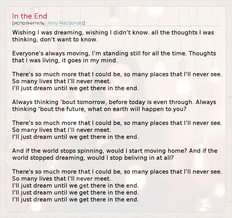 В 2007 году на мировой сцене появилась новая многообещающая исполнительница Эми Макдональд. Тогда ее мало кто знал, но ситуация эта изменилась очень быстро, поскольку композиции молодой певицы оказались удивительно хороши. Прекрасная смесь из легкого рока и фолк-музыки пришлась по вкусу меломанам, а критики, приятно удивленные таким неожиданным появлением новой яркой исполнительницы, писали исключительно положительные отзывы в адрес This Is The Life. Как это часто бывает, после выхода отличного дебютного альбома на артиста ложится огромная ответственность – не разочаровать слушателей. Ведь если первый лонгплей удался на славу, это значит, что второму нужно быть ничуть не хуже. В 2010 году ожидания меломанов полностью оправдались, так как A Curious Thing оказался прекрасным продолжением дебютной работы Макдональд. Фолк-мотивы, удачно вплетенные в антураж рока, быстро нашли свою аудиторию. В общем-то, это неудивительно, ведь песни Эми всегда несут в себе какие-то эмоции. Певица вкладывает в творчество свои чувства и переживания, а без них ни одна последовательность нот не сможет стать полноценной песней. Летом 2012 года Макдональд пополнила свою дискографию свежей пластинкой, получившей светлое и жизнеутверждающее название Life in a Beautiful Light.
