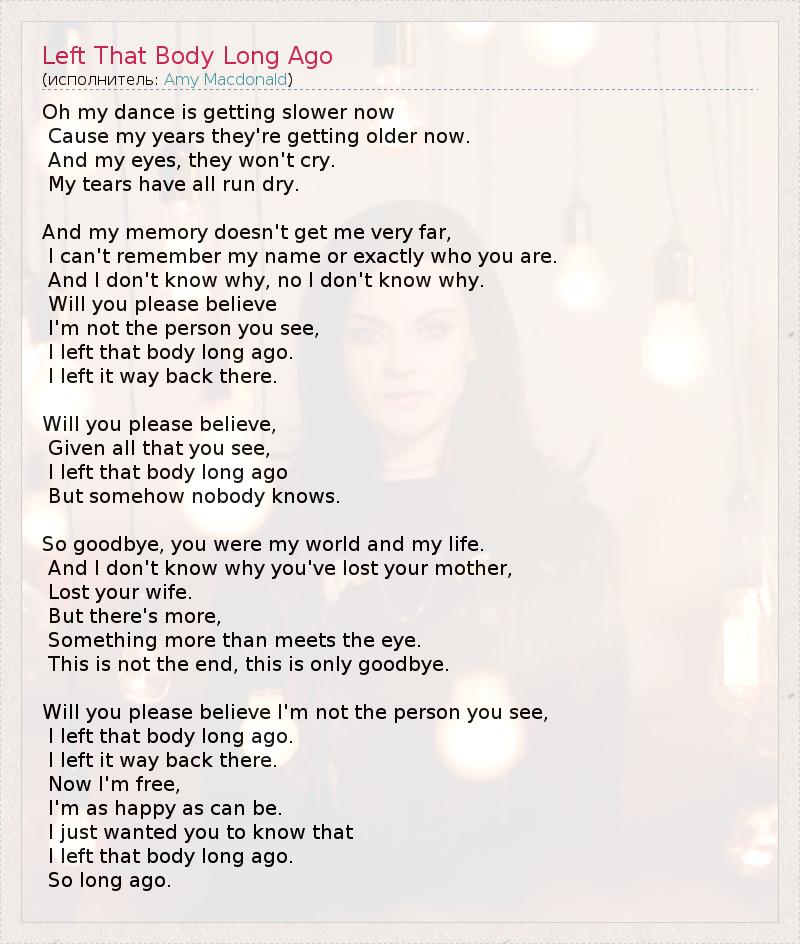 А как ты думаешь, о чем песня "Left That Body Long Ago" ?