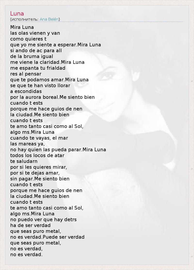 Mira Luna las olas vienen y van como quieres t que yo me siente a esperar.Mira Luna si ando de ac para all de la bruma igual me viene la claridad.Mira Luna me espanta tu frialdad res al pensar que te podamos amar.Mira Luna se que te han visto llorar a escondidas por la aurora boreal.Me siento bien cuando t ests porque me hace guios de nen la ciudad.Me siento bien cuando t ests te amo tanto casi como al Sol, algo ms.Mira Luna cuando te vayas, el mar las mareas ya, no hay quien las pueda parar.Mira Luna todos los locos de atar te saludarn por si les quieres mirar, por si te dejas amar, sin pagar.Me siento bien cuando t ests porque me hace guios de nen la ciudad.Me siento bien cuando t ests te amo tanto casi como al Sol, algo ms.Mira Luna no puedo ver que hay detrs ha de ser verdad que seas puro metal, no es verdad.Puede ser verdad que seas puro metal, no es verdad, no es verdad.