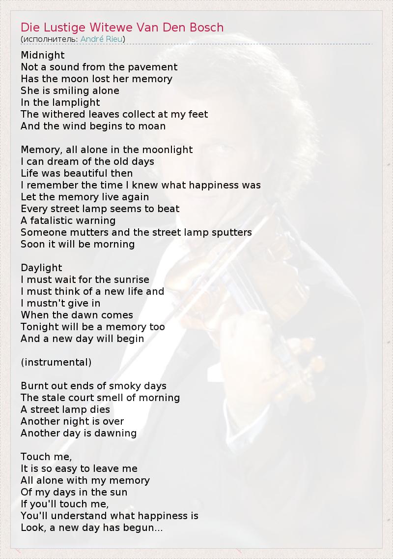 Midnight Not a sound from the pavement Has the moon lost her memory She is smiling alone In the lamplight The withered leaves collect at my feet And the wind begins to moan Memory, all alone in the moonlight I can dream of the old days Life was beautiful then I remember the time I knew what happiness was Let the memory live again Every street lamp seems to beat A fatalistic warning Someone mutters and the street lamp sputters Soon it will be morning Daylight I must wait for the sunrise I must think of a new life and I mustn't give in When the dawn comes Tonight will be a memory too And a new day will begin (instrumental) Burnt out ends of smoky days The stale court smell of morning A street lamp dies Another night is over Another day is dawning Touch me, It is so easy to leave me All alone with my memory Of my days in the sun If you'll touch me, You'll understand what happiness is Look, a new day has begun...