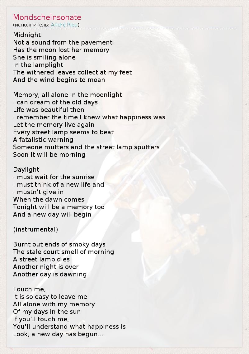 Midnight Not a sound from the pavement Has the moon lost her memory She is smiling alone In the lamplight The withered leaves collect at my feet And the wind begins to moan Memory, all alone in the moonlight I can dream of the old days Life was beautiful then I remember the time I knew what happiness was Let the memory live again Every street lamp seems to beat A fatalistic warning Someone mutters and the street lamp sputters Soon it will be morning Daylight I must wait for the sunrise I must think of a new life and I mustn't give in When the dawn comes Tonight will be a memory too And a new day will begin (instrumental) Burnt out ends of smoky days The stale court smell of morning A street lamp dies Another night is over Another day is dawning Touch me, It is so easy to leave me All alone with my memory Of my days in the sun If you'll touch me, You'll understand what happiness is Look, a new day has begun...