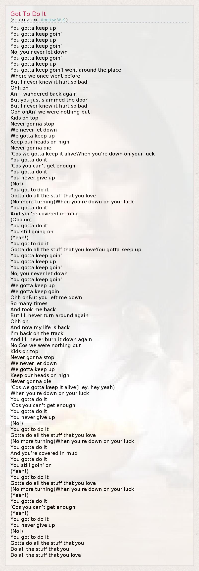 You gotta keep up You gotta keep goin' You gotta keep up You gotta keep goin' No, you never let down You gotta keep goin' You gotta keep up You gotta keep goin'I went around the place Where we once went before But I never knew it hurt so bad Ohh oh An' I wandered back again But you just slammed the door But I never knew it hurt so bad Ooh ohAn' we were nothing but Kids on top Never gonna stop We never let down We gotta keep up Keep our heads on high Never gonna die 'Cos we gotta keep it aliveWhen you're down on your luck You gotta do it 'Cos you can't get enough You gotta do it You never give up (No!) You got to do it Gotta do all the stuff that you love (No more turning)When you're down on your luck You gotta do it And you're covered in mud (Ooo oo) You gotta do it You still going on (Yeah!) You got to do it Gotta do all the stuff that you loveYou gotta keep up You gotta keep goin' You gotta keep up You gotta keep goin' No, you never let down You gotta keep goin' We gotta keep up We gotta keep goin' Ohh ohBut you left me down So many times And took me back But I'll never turn around again Ohh oh And now my life is back I'm back on the track And I'll never burn it down again No'Cos we were nothing but Kids on top Never gonna stop We never let down We gotta keep up Keep our heads on high Never gonna die 'Cos we gotta keep it alive(Hey, hey yeah) When you're down on your luck You gotta do it 'Cos you can't get enough You gotta do it You never give up (No!) You got to do it Gotta do all the stuff that you love (No more turning)When you're down on your luck You gotta do it And you're covered in mud You gotta do it You still goin' on (Yeah!) You got to do it Gotta do all the stuff that you love (No more turning)When you're down on your luck (Yeah!) You gotta do it 'Cos you can't get enough (Yeah!) You got to do it You never give up (No!) You got to do it Gotta do all the stuff that you Do all the stuff that you Do all the stuff that you love