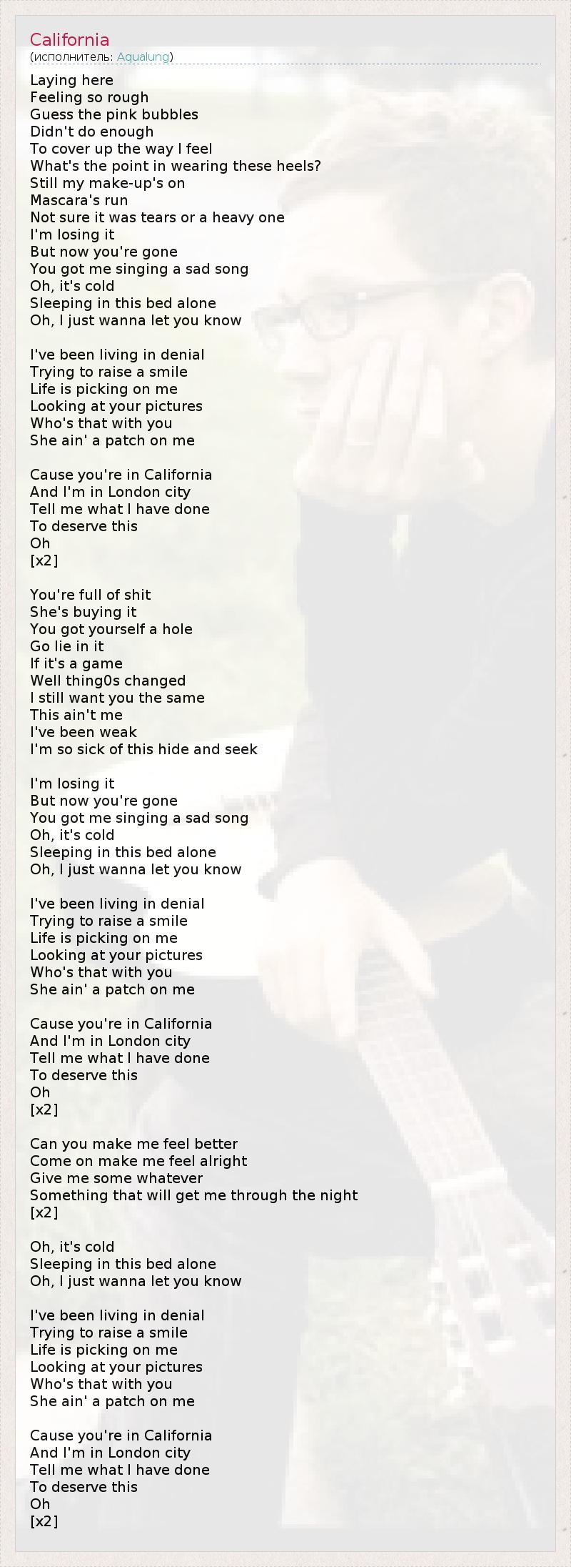 Лежу здесь И чувствую себя ужасно, Полагаю, что розовых пузырьков Недостаточно, Чтобы скрыть мои чувства, Какой смысл надевать эти шпильки? Я все еще накрашена, Моя тушь потекла, Не уверена, слезы это или алкоголь, Я сама не своя, Но теперь ты ушел И вынуждаешь меня петь грустную песню, О, холодно Спать на этой кровати одной, О, я просто хочу, чтобы ты знал... Я живу в отрицании, Пытаюсь улыбаться, Но жизнь меня подкалывает, Смотрю на твои фото, Кто это с тобой? Она мне и в подмётки не годится... Потому что ты в Калифорнии, А я в Лондоне, Скажи, что я сделала, Чтобы это заслужить? Оу... [x2] Ты полон де*ьма, А она покупается, Ты выкопал себе яму, Так ложись в нее, Если это все - игра, То многое изменилось, Я все еще хочу тебя прежнего, Это не я, Я была слабой, И меня тошнит от этих пряток... Я сама не своя, Но теперь ты ушел И вынуждаешь меня петь грустную песню, О, холодно Спать на этой кровати одной, О, я просто хочу, чтобы ты знал... Я живу в отрицании, Пытаюсь улыбаться, Но жизнь меня подкалывает, Смотрю на твои фото, Кто это с тобой? Она мне и в подмётки не годится... Потому что ты в Калифорнии, А я в Лондоне, Скажи, что я сделала, Чтобы это заслужить? Оу... [x2] Можешь ли ты меня утешить, Давай же, подними мне настроение, Дай мне что-нибудь, То, что поможет пережить эту ночь... [x2] О, холодно Спать на этой кровати одной, О, я просто хочу, чтобы ты знал... Я живу в отрицании, Пытаюсь улыбаться, Но жизнь меня подкалывает, Смотрю на твои фото, Кто это с тобой? Она мне и в подмётки не годится... Потому что ты в Калифорнии, А я в Лондоне, Скажи, что я сделала, Чтобы это заслужить? Оу... [x2]
