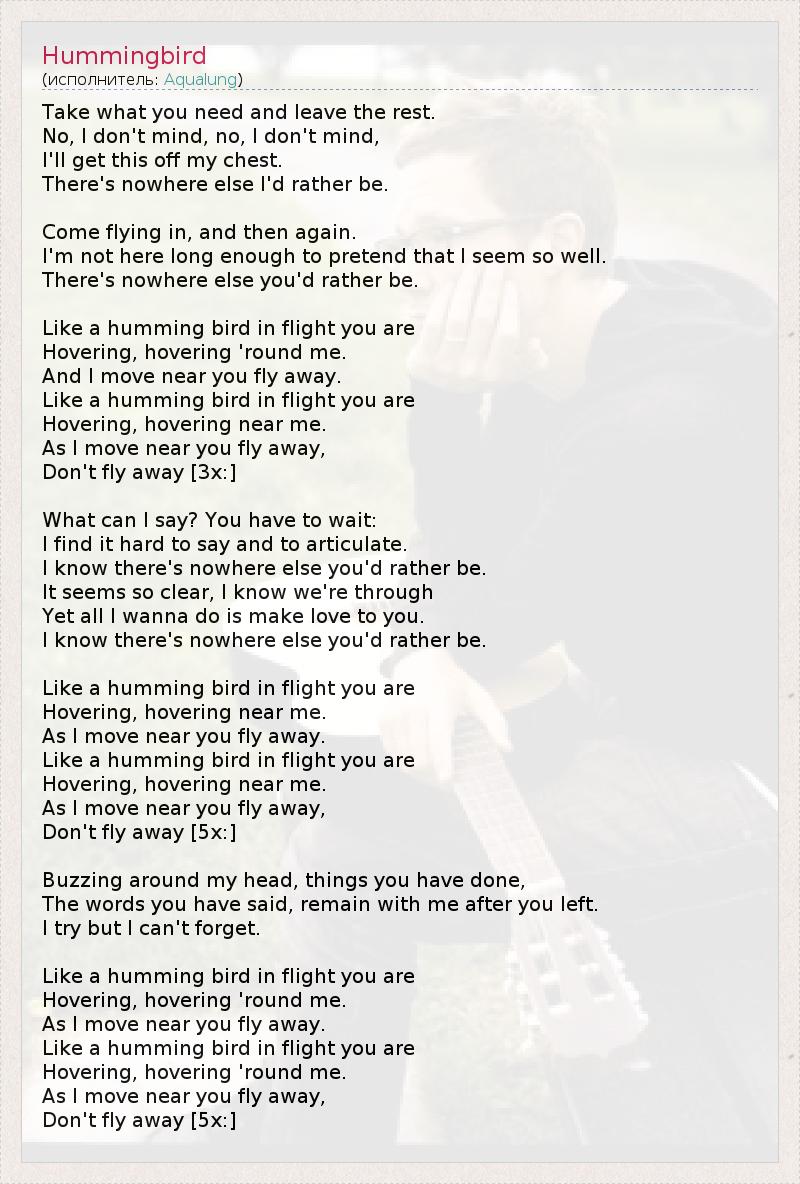 Take what you need and leave the rest. No, I don't mind, no, I don't mind, I'll get this off my chest. There's nowhere else I'd rather be. Come flying in, and then again. I'm not here long enough to pretend that I seem so well. There's nowhere else you'd rather be. Like a humming bird in flight you are Hovering, hovering 'round me. And I move near you fly away. Like a humming bird in flight you are Hovering, hovering near me. As I move near you fly away, Don't fly away [3x:] What can I say? You have to wait: I find it hard to say and to articulate. I know there's nowhere else you'd rather be. It seems so clear, I know we're through Yet all I wanna do is make love to you. I know there's nowhere else you'd rather be. Like a humming bird in flight you are Hovering, hovering near me. As I move near you fly away. Like a humming bird in flight you are Hovering, hovering near me. As I move near you fly away, Don't fly away [5x:] Buzzing around my head, things you have done, The words you have said, remain with me after you left. I try but I can't forget. Like a humming bird in flight you are Hovering, hovering 'round me. As I move near you fly away. Like a humming bird in flight you are Hovering, hovering 'round me. As I move near you fly away, Don't fly away [5x:]
