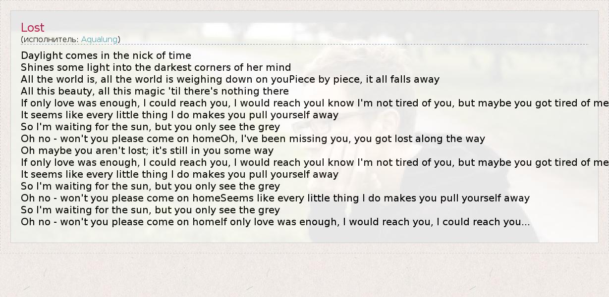 Это интересно:Мэтт Хэйлс, более знакомый массам под псевдонимом Aqualung - британский сочинитель-исполнитель наиболее извеcтный по своему хиту Strange & Beautiful (I'll Put A Spell On You), который был задействован в рекламе Volkswagen Beetle в 2002 году и позже попал в топ-10 британского чарта синглов. При этом самое забавное, что в Америке музыкант известен в основном по песне Brighter... продолжение