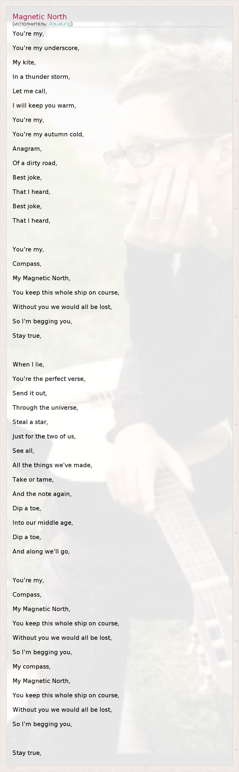 You're my, You're my underscore, My kite, In a thunder storm, Let me call, I will keep you warm, You're my, You're my autumn cold, Anagram, Of a dirty road, Best joke, That I heard, Best joke, That I heard, You're my, Compass, My Magnetic North, You keep this whole ship on course, Without you we would all be lost, So I'm begging you, Stay true, When I lie, You're the perfect verse, Send it out, Through the universe, Steal a star, Just for the two of us, See all, All the things we've made, Take or tame, And the note again, Dip a toe, Into our middle age, Dip a toe, And along we'll go, You're my, Compass, My Magnetic North, You keep this whole ship on course, Without you we would all be lost, So I'm begging you, My compass, My Magnetic North, You keep this whole ship on course, Without you we would all be lost, So I'm begging you, Stay true,