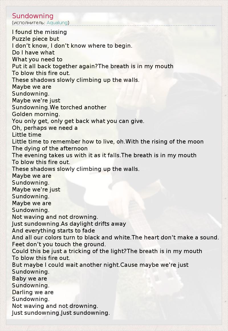 I found the missing Puzzle piece but I don't know, I don't know where to begin. Do I have what What you need to Put it all back together again?The breath is in my mouth To blow this fire out. These shadows slowly climbing up the walls. Maybe we are Sundowning. Maybe we're just Sundowning.We torched another Golden morning. You only get, only get back what you can give. Oh, perhaps we need a Little time Little time to remember how to live, oh.With the rising of the moon The dying of the afternoon The evening takes us with it as it falls.The breath is in my mouth To blow this fire out. These shadows slowly climbing up the walls. Maybe we are Sundowning. Maybe we're just Sundowning. Maybe we are Sundowning. Not waving and not drowning. Just sundowning.As daylight drifts away And everything starts to fade And all our colors turn to black and white.The heart don't make a sound. Feet don't you touch the ground. Could this be just a tricking of the light?The breath is in my mouth To blow this fire out. But maybe I could wait another night.Cause maybe we're just Sundowning. Baby we are Sundowning. Darling we are Sundowning. Not waving and not drowning. Just sundowning.Just sundowning.