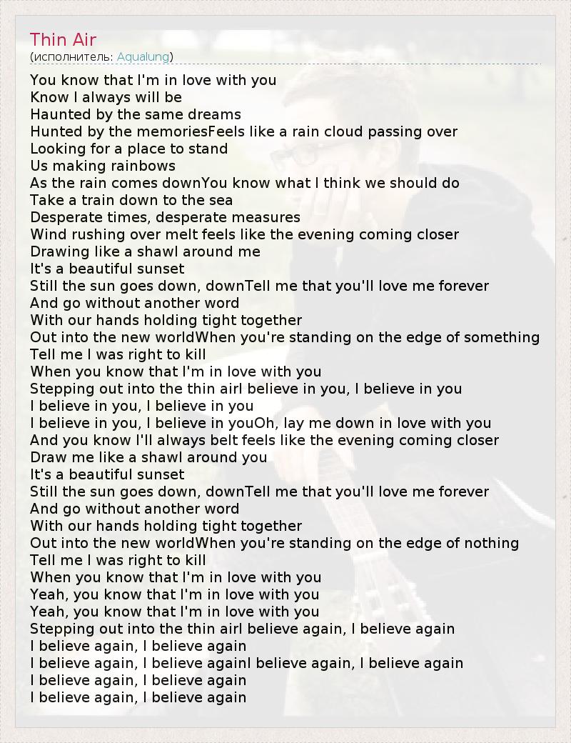 You know that I'm in love with you Know I always will be Haunted by the same dreams Hunted by the memoriesFeels like a rain cloud passing over Looking for a place to stand Us making rainbows As the rain comes downYou know what I think we should do Take a train down to the sea Desperate times, desperate measures Wind rushing over meIt feels like the evening coming closer Drawing like a shawl around me It's a beautiful sunset Still the sun goes down, downTell me that you'll love me forever And go without another word With our hands holding tight together Out into the new worldWhen you're standing on the edge of something Tell me I was right to kill When you know that I'm in love with you Stepping out into the thin airI believe in you, I believe in you I believe in you, I believe in you I believe in you, I believe in youOh, lay me down in love with you And you know I'll always beIt feels like the evening coming closer Draw me like a shawl around you It's a beautiful sunset Still the sun goes down, downTell me that you'll love me forever And go without another word With our hands holding tight together Out into the new worldWhen you're standing on the edge of nothing Tell me I was right to kill When you know that I'm in love with you Yeah, you know that I'm in love with you Yeah, you know that I'm in love with you Stepping out into the thin airI believe again, I believe again I believe again, I believe again I believe again, I believe againI believe again, I believe again I believe again, I believe again I believe again, I believe again