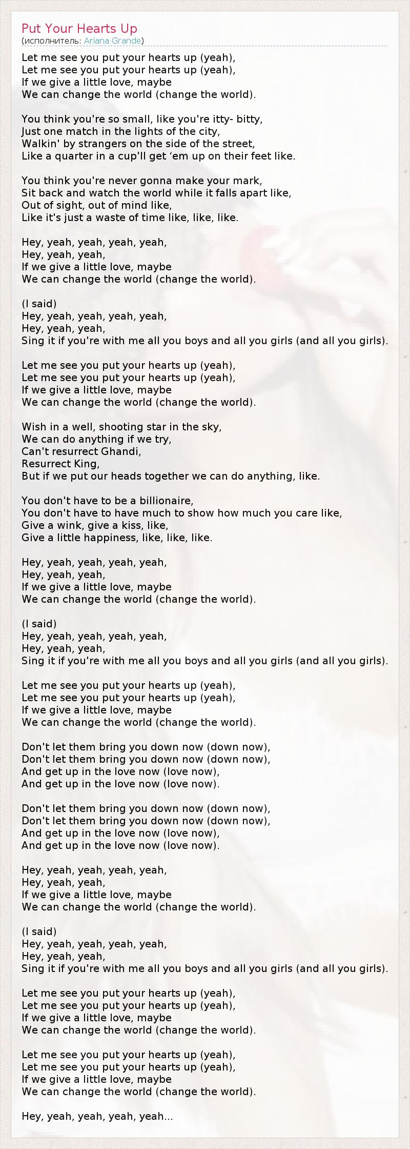 А как ты думаешь, о чем песня "Put Your Hearts Up" ?