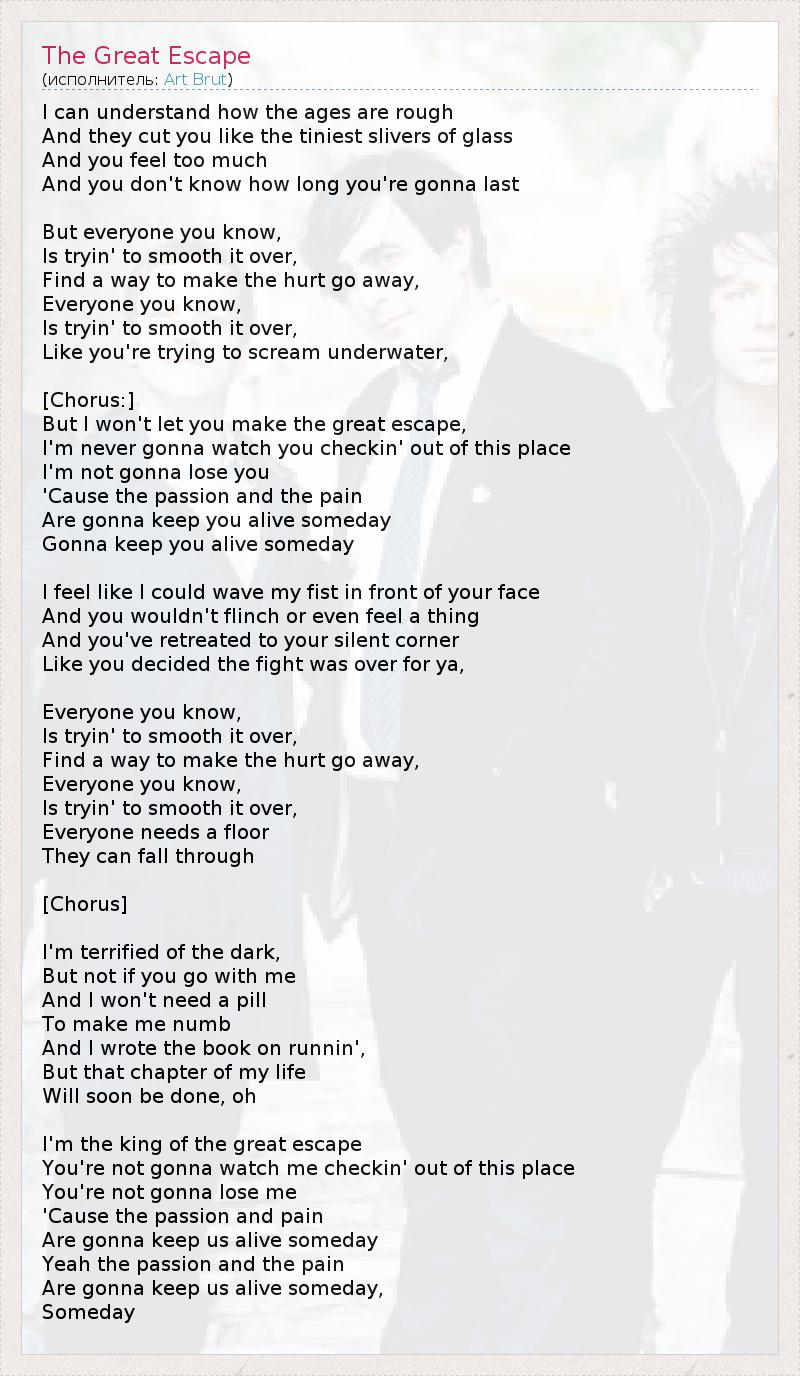 Я понимаю, какими тяжелыми бывают времена, И они ранят тебя, словно мелкие осколки стекла. И ты столько всего чувствуешь, И ты не знаешь, сколько ещё сможешь продержаться. Но все, кого ты знаешь, Пытаются всё сгладить, Найти способ прогнать боль. Все, кого ты знаешь, Пытаются всё сгладить, Как ты будто пытаешься кричать под водой. [Припев:] Но я не позволю тебе совершить большой побег, Я не собираюсь смотреть, как ты уходишь, Я не собираюсь терять тебя. Потому что страсть и боль Когда-нибудь помогут тебе выжить, Помогут тебе выжить. Такое чувство, что я могу помахать рукой у тебя перед глазами, Но ты не вздрогнешь и даже ничего не почувствуешь. И ты удалился в свой тихий уголок, Словно решил, что для тебя борьба уже закончена. Все, кого ты знаешь, Пытаются всё сгладить, Найти способ прогнать боль. Все, кого ты знаешь, Пытаются всё сгладить, Ведь каждому нужна земля, Сквозь которую он мог бы провалиться. [Припев] Я напугана темнотой, Но если ты пойдешь со мной, Мне будут не нужны никакие таблетки, Чтобы заставить меня оцепенеть. Я написала целое пособие о побегах, Но эта глава моей жизни Скоро будет закончена. Ведь я королева больших побегов. Ты не будешь смотреть, как я ухожу, Ты не потеряешь меня. Потому что страсть и боль Когда-нибудь помогут нам выжить. Да, страсть и боль Когда-нибудь помогут нам выжить, Когда-нибудь...