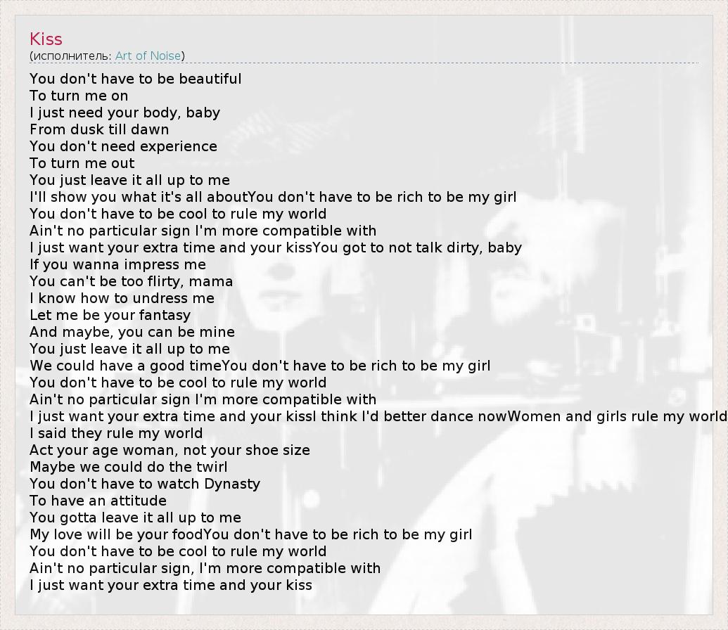 You don't have to be beautiful To turn me on I just need your body, baby From dusk till dawn You don't need experience To turn me out You just leave it all up to me I'll show you what it's all aboutYou don't have to be rich to be my girl You don't have to be cool to rule my world Ain't no particular sign I'm more compatible with I just want your extra time and your kissYou got to not talk dirty, baby If you wanna impress me You can't be too flirty, mama I know how to undress me Let me be your fantasy And maybe, you can be mine You just leave it all up to me We could have a good timeYou don't have to be rich to be my girl You don't have to be cool to rule my world Ain't no particular sign I'm more compatible with I just want your extra time and your kissI think I'd better dance nowWomen and girls rule my world I said they rule my world Act your age woman, not your shoe size Maybe we could do the twirl You don't have to watch Dynasty To have an attitude You gotta leave it all up to me My love will be your foodYou don't have to be rich to be my girl You don't have to be cool to rule my world Ain't no particular sign, I'm more compatible with I just want your extra time and your kiss
