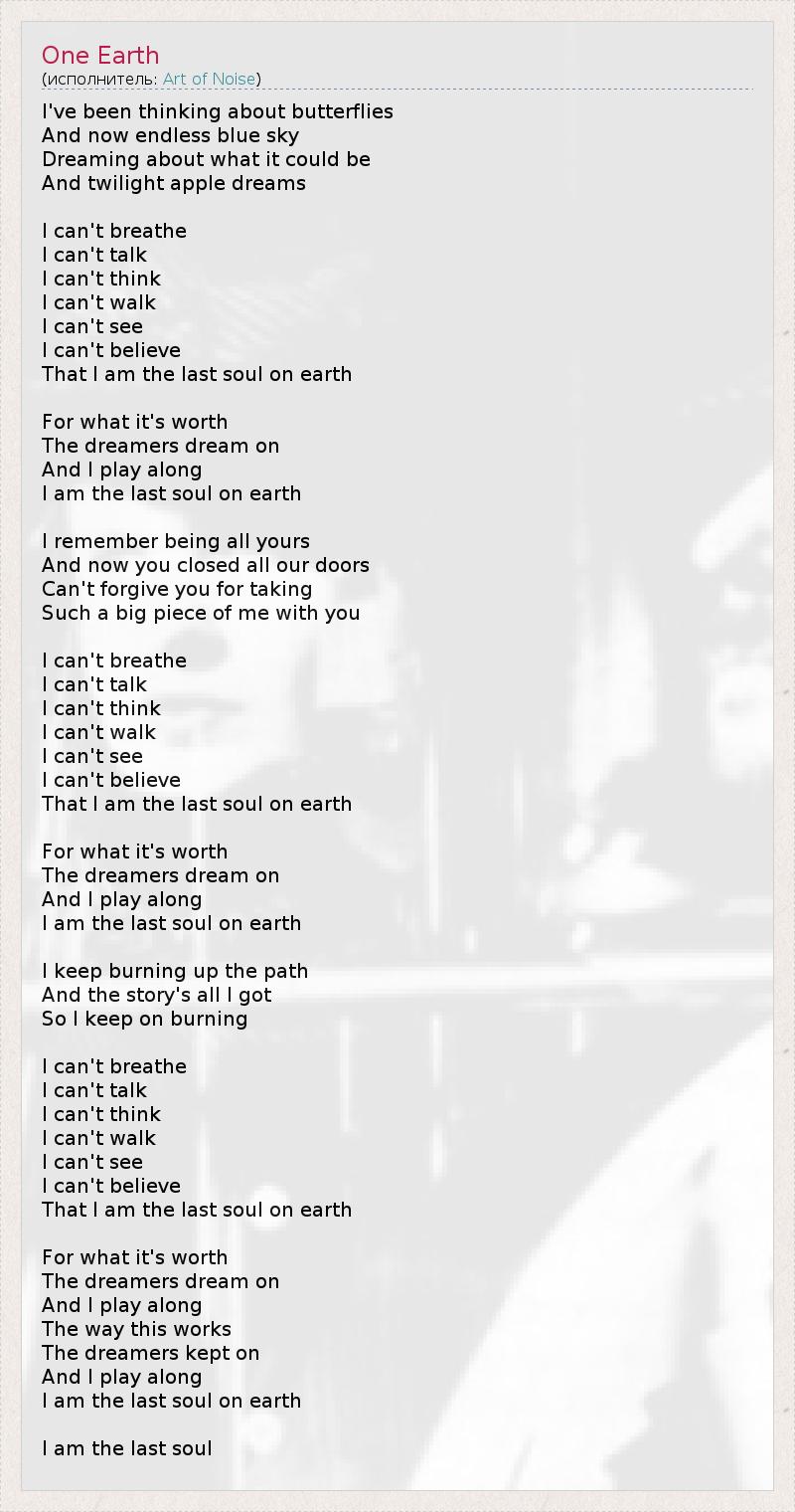 I've been thinking about butterflies And now endless blue sky Dreaming about what it could be And twilight apple dreams I can't breathe I can't talk I can't think I can't walk I can't see I can't believe That I am the last soul on earth For what it's worth The dreamers dream on And I play along I am the last soul on earth I remember being all yours And now you closed all our doors Can't forgive you for taking Such a big piece of me with you I can't breathe I can't talk I can't think I can't walk I can't see I can't believe That I am the last soul on earth For what it's worth The dreamers dream on And I play along I am the last soul on earth I keep burning up the path And the story's all I got So I keep on burning I can't breathe I can't talk I can't think I can't walk I can't see I can't believe That I am the last soul on earth For what it's worth The dreamers dream on And I play along The way this works The dreamers kept on And I play along I am the last soul on earth I am the last soul