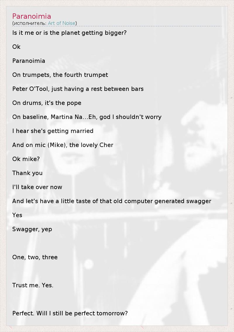 Is it me or is the planet getting bigger? Ok Paranoimia On trumpets, the fourth trumpet Peter O'Tool, just having a rest between bars On drums, it's the pope On baseline, Martina Na…Eh, god I shouldn't worry I hear she's getting married And on mic (Mike), the lovely Cher Ok mike? Thank you I'll take over now And let's have a little taste of that old computer generated swagger Yes Swagger, yep One, two, three Trust me. Yes. Perfect. Will I still be perfect tomorrow?