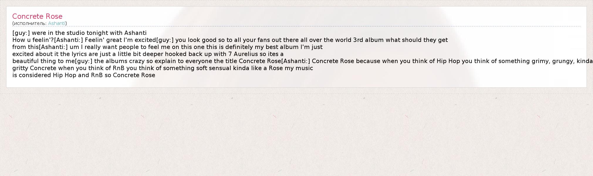 beautiful thing to me[guy:] the albums crazy so explain to everyone the title Concrete Rose[Ashanti:] Concrete Rose because when you think of Hip Hop you think of something grimy, grungy, kinda