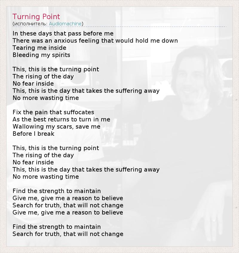 В эти дни, что проходят мимо меня Что-то тревожит и сдерживает меня Разрывая изнутри И моя душа кровоточит Это поворотный момент Восход дня Никакого страха внутри Это день, который унесет страдания И больше никакой пустой траты времени Исправь эту боль, что душит Когда лучшее возвращается, чтобы изменить меня, Залечивая раны, спаси меня Пока я не сломлен Это поворотный момент Восход дня Никакого страха внутри Это день, который унесет страдания И больше никакой пустой траты времени Найди силу, чтобы продолжить Дай мне, дай мне повод верить Искать правду, которая не изменится Дай мне, дай мне повод верить Найди силу, чтобы продолжить Искать правду, которая не изменится