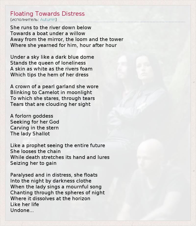 She runs to the river down below Towards a boat under a willow Away from the mirror, the loom and the tower Where she yearned for him, hour after hour Under a sky like a dark blue dome Stands the queen of loneliness A skin as white as the rivers foam Which tips the hem of her dress A crown of a pearl garland she wore Blinking to Camelot in moonlight To which she stares, through tears Tears that are clouding her sight A forlorn goddess Seeking for her God Carving in the stern The lady Shallot Like a prophet seeing the entire future She looses the chain While death stretches its hand and lures Seizing her to gain Paralysed and in distress, she floats Into the night by darkness clothe When the lady sings a mournful song Chanting through the spheres of night Where it dissolves at the horizon Like her life Undone...