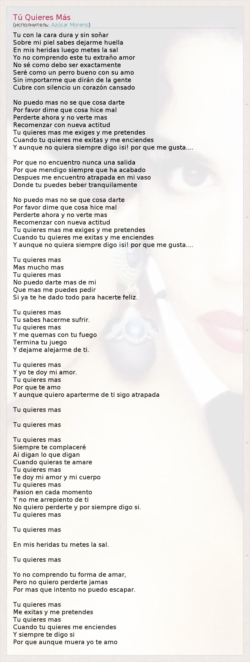 Ту кон ла Кара твердая у грех Sonar Sobre миль Piel sabes dejarme Huella Собственная неправильно heridas Luego Metes-ла-Саль Не Yo нет comprendo Эсте ту extraño Amor Нет sé Комо Debo сер exactamente СЕР Комо ООН Перро Буэно кон су АМО Грех importarme Que Диран-де-ла Gente Cubre кон Silencio ООН corazón cansado Нет puedo не Mas Que не себе Коза darte Пор пользу копейки Que Коза hice мал Perderte Ahora у нет Verte Mas Recomenzar кон Нуэва actitud Ту Quieres Рождество мне exiges у меня pretendes Cuando ту Quieres мне exitas у меня enciendes У не aunque не quiera Siempre DIGO ¡си! POR Que мне Gusta .... Пор Que не Encuentro NUNCA уна Salida Пор Que Mendigo Siempre Que га acabado Despues мне Encuentro atrapada ан миль вазо Donde ту puedes Beber tranquilamente Нет puedo не Mas Que не себе Коза darte Пор пользу копейки Que Коза hice мал Perderte Ahora у нет Verte Mas Recomenzar кон Нуэва actitud Ту Quieres Рождество мне exiges у меня pretendes Cuando ту Quieres мне exitas у меня enciendes У не aunque не quiera Siempre DIGO ¡си! POR Que мне Gusta .... Ту Quieres мас Мас Mucho Mas Ту Quieres мас Нет puedo darte Mas De миль Que Mas мне puedes pedir Си Я. т.е он пьедестала TODO пункт hacerte Фелис. Ту Quieres мас Ту sabes hacerme sufrir. Ту Quieres мас У меня quemas кон ту Fuego Termina ту Juego У Dejame alejarme де ти. Ту Quieres мас У йо те дой Mi Amor. Ту Quieres мас Пор Que те АМО У aunque Quiero aparterme де ти Sigo atrapada Ту Quieres мас Ту Quieres мас Ту Quieres мас Siempre те complaceré Ай digan вот Que digan Cuando quieras те Амаре Ту Quieres мас Те дой Mi Amor у миль Cuerpo Ту Quieres мас Pasion ан Када Momento Не Y Нет мне arrepiento де ти Нет Quiero perderte у POR Siempre DIGO си. Ту Quieres мас Ту Quieres мас En неправильно heridas ту отмеряет-ла-Саль. Ту Quieres мас Йо не comprendo ту Forma-де-Амар, Не Перо не Quiero perderte JAMAS Por Que Mas не intento не puedo escapar. Ту Quieres мас Я exitas у меня pretendes Ту Quieres мас Cuando ту Quieres мне enciendes У Siempre те DIGO си Пор Que aunque muera лет те АМО