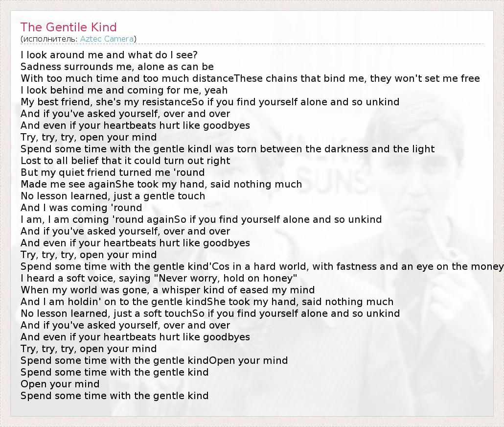 Spend some time with the gentle kind'Cos in a hard world, with fastness and an eye on the money