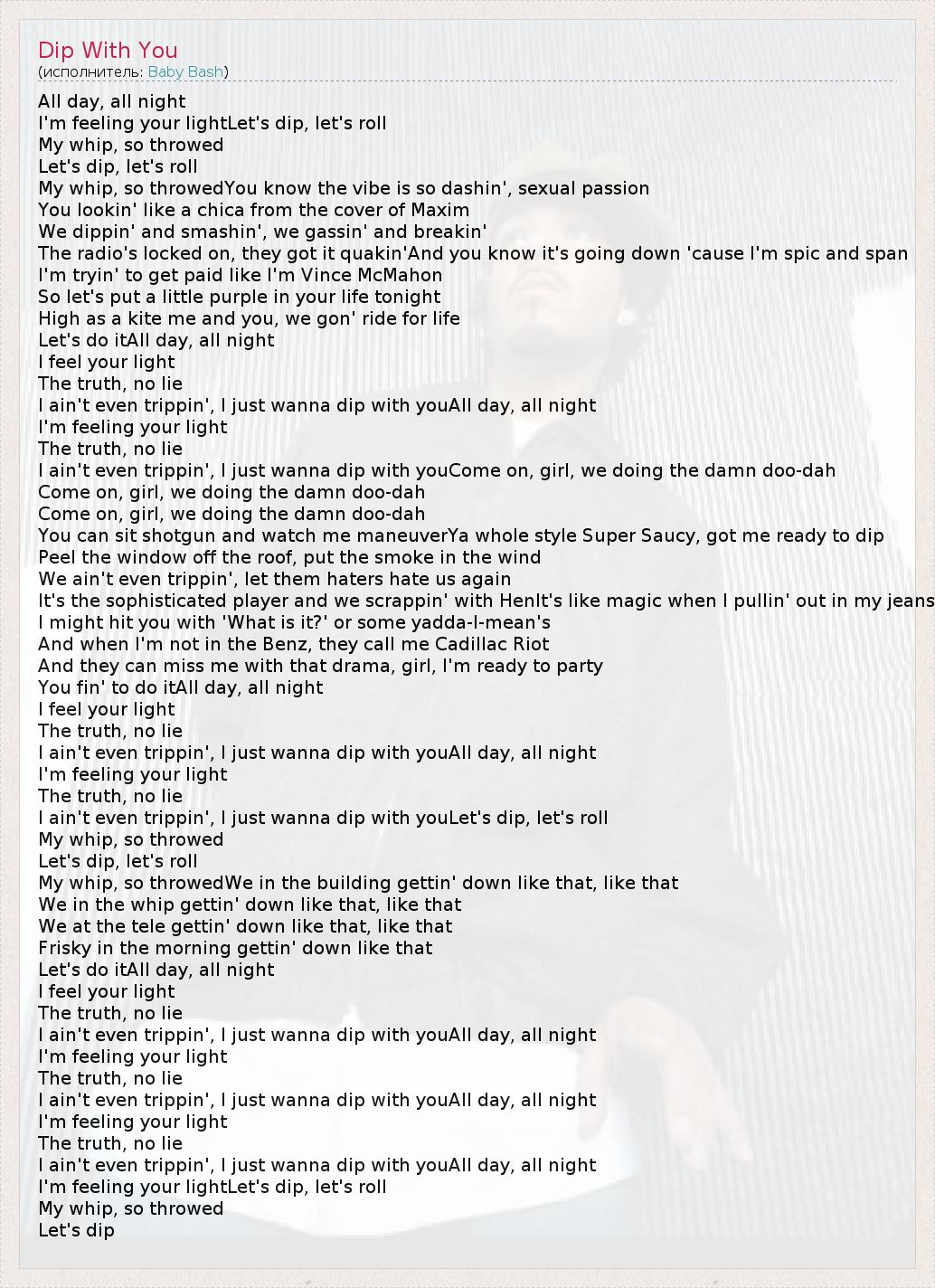 All day, all night I'm feeling your lightLet's dip, let's roll My whip, so throwed Let's dip, let's roll My whip, so throwedYou know the vibe is so dashin', sexual passion You lookin' like a chica from the cover of Maxim We dippin' and smashin', we gassin' and breakin' The radio's locked on, they got it quakin'And you know it's going down 'cause I'm spic and span I'm tryin' to get paid like I'm Vince McMahon So let's put a little purple in your life tonight High as a kite me and you, we gon' ride for life Let's do itAll day, all night I feel your light The truth, no lie I ain't even trippin', I just wanna dip with youAll day, all night I'm feeling your light The truth, no lie I ain't even trippin', I just wanna dip with youCome on, girl, we doing the damn doo-dah Come on, girl, we doing the damn doo-dah Come on, girl, we doing the damn doo-dah You can sit shotgun and watch me maneuverYa whole style Super Saucy, got me ready to dip Peel the window off the roof, put the smoke in the wind We ain't even trippin', let them haters hate us again It's the sophisticated player and we scrappin' with HenIt's like magic when I pullin' out in my jeans I might hit you with 'What is it?' or some yadda-I-mean's And when I'm not in the Benz, they call me Cadillac Riot And they can miss me with that drama, girl, I'm ready to party You fin' to do itAll day, all night I feel your light The truth, no lie I ain't even trippin', I just wanna dip with youAll day, all night I'm feeling your light The truth, no lie I ain't even trippin', I just wanna dip with youLet's dip, let's roll My whip, so throwed Let's dip, let's roll My whip, so throwedWe in the building gettin' down like that, like that We in the whip gettin' down like that, like that We at the tele gettin' down like that, like that Frisky in the morning gettin' down like that Let's do itAll day, all night I feel your light The truth, no lie I ain't even trippin', I just wanna dip with youAll day, all night I'm feeling your light The truth, no lie I ain't even trippin', I just wanna dip with youAll day, all night I'm feeling your light The truth, no lie I ain't even trippin', I just wanna dip with youAll day, all night I'm feeling your lightLet's dip, let's roll My whip, so throwed Let's dip