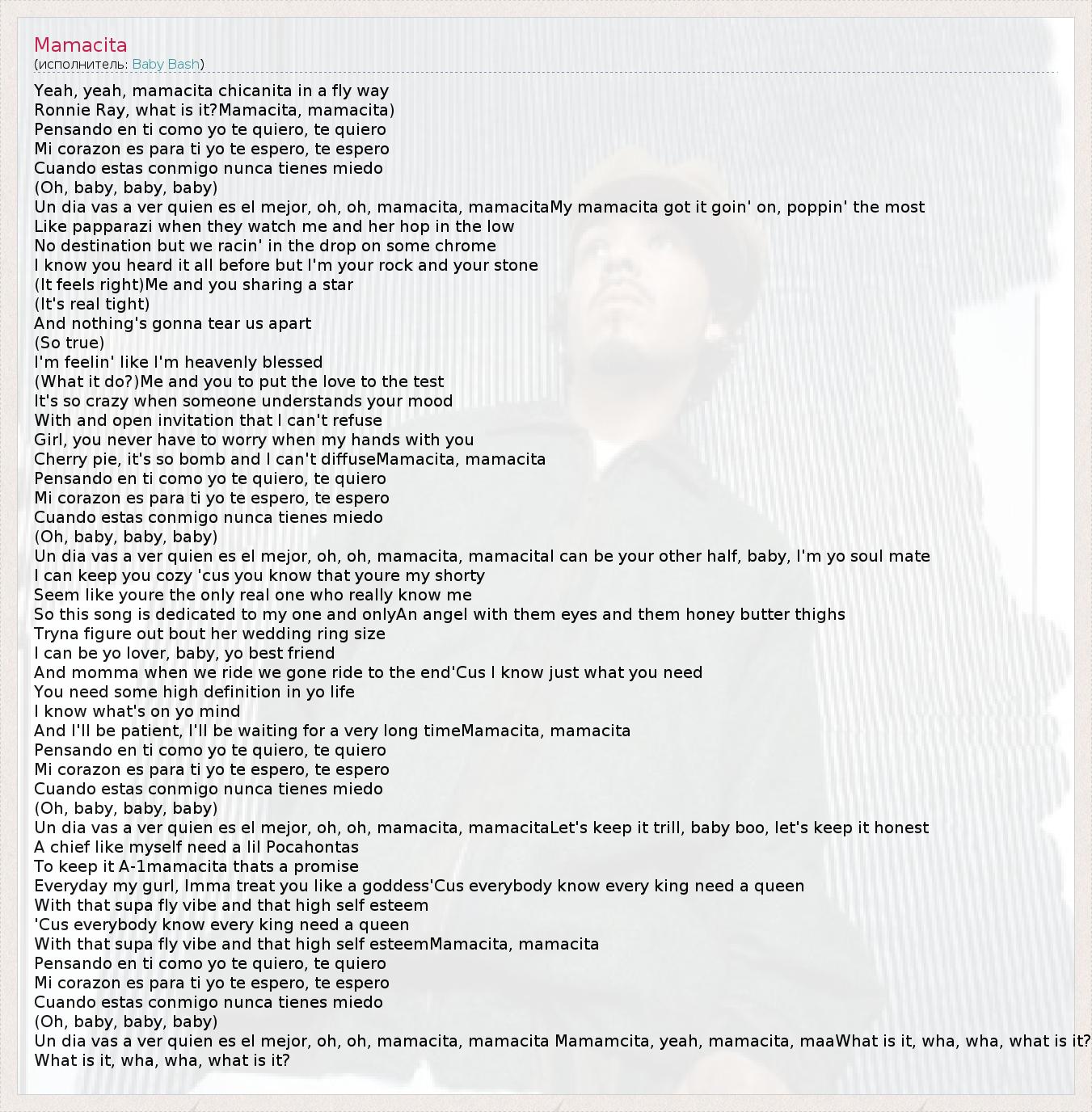 Это интересно:Baby Bash, так же известный как Baby Beesh (настоящее имя Ronnie Ray Bryant), родился 18 октября 1975 года в Калифорнии. Американский реп-исполнитель. Родители Baby Bash увлеклись героином, поэтому его воспитанием занимались его дядя и бабушка. У Baby Bash были способности к баскетболу, он даже играл в колледжской команде в середине девяностых годов. Но из-за частых травм и нежелания показываться врачу, карьера баскетболиста... продолжение
