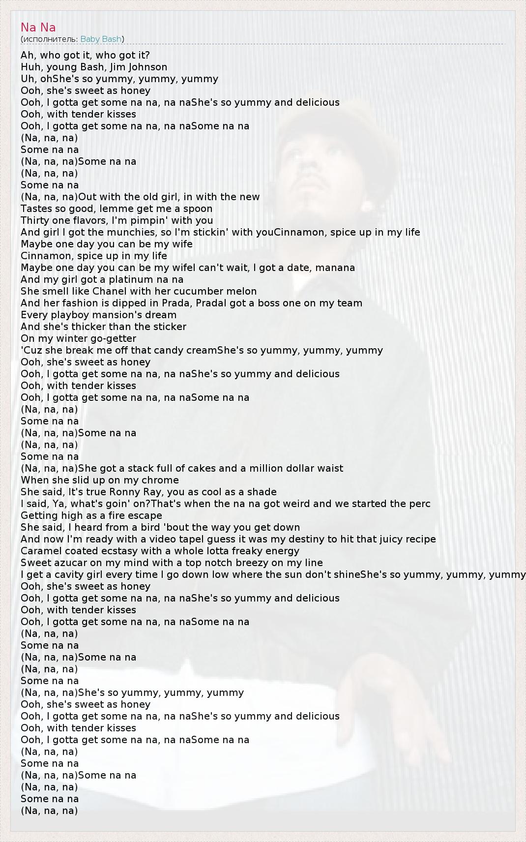 Это интересно:Baby Bash, так же известный как Baby Beesh (настоящее имя Ronnie Ray Bryant), родился 18 октября 1975 года в Калифорнии. Американский реп-исполнитель. Родители Baby Bash увлеклись героином, поэтому его воспитанием занимались его дядя и бабушка. У Baby Bash были способности к баскетболу, он даже играл в колледжской команде в середине девяностых годов. Но из-за частых травм и нежелания показываться врачу, карьера баскетболиста... продолжение