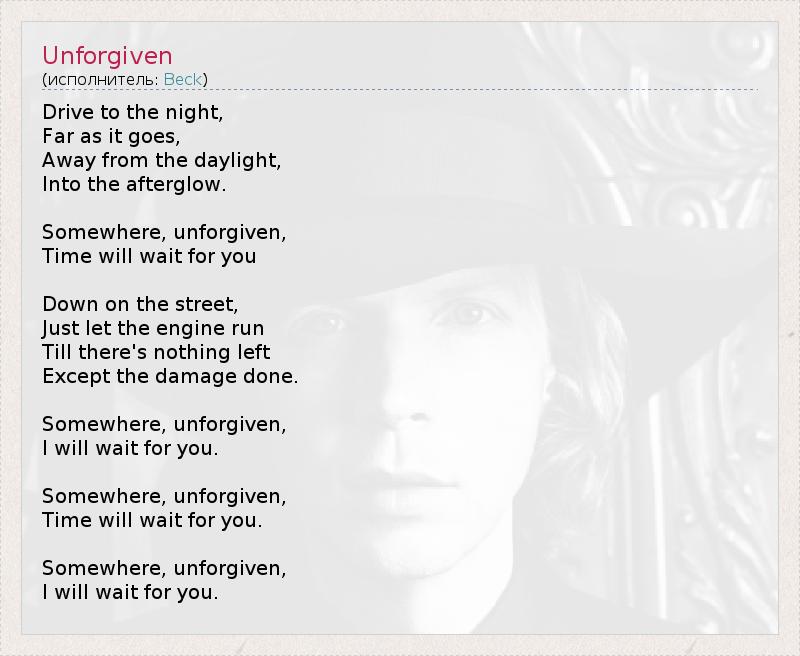 Drive to the night, Far as it goes, Away from the daylight, Into the afterglow. Somewhere, unforgiven, Time will wait for you Down on the street, Just let the engine run Till there's nothing left Except the damage done. Somewhere, unforgiven, I will wait for you. Somewhere, unforgiven, Time will wait for you. Somewhere, unforgiven, I will wait for you.