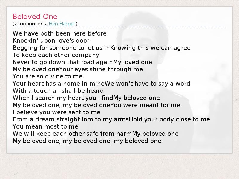 We have both been here before Knockin' upon love's door Begging for someone to let us inKnowing this we can agree To keep each other company Never to go down that road againMy loved one My beloved oneYour eyes shine through me You are so divine to me Your heart has a home in mineWe won't have to say a word With a touch all shall be heard When I search my heart you I findMy beloved one My beloved one, my beloved oneYou were meant for me I believe you were sent to me From a dream straight into to my armsHold your body close to me You mean most to me We will keep each other safe from harmMy beloved one My beloved one, my beloved one, my beloved one
