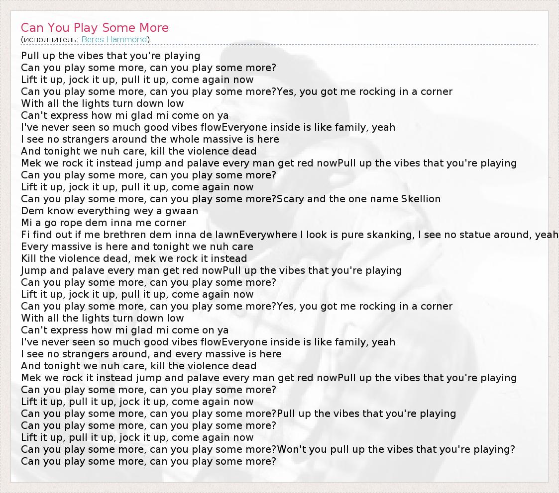 Pull up the vibes that you're playing Can you play some more, can you play some more? Lift it up, jock it up, pull it up, come again now Can you play some more, can you play some more?Yes, you got me rocking in a corner With all the lights turn down low Can't express how mi glad mi come on ya I've never seen so much good vibes flowEveryone inside is like family, yeah I see no strangers around the whole massive is here And tonight we nuh care, kill the violence dead Mek we rock it instead jump and palave every man get red nowPull up the vibes that you're playing Can you play some more, can you play some more? Lift it up, jock it up, pull it up, come again now Can you play some more, can you play some more?Scary and the one name Skellion Dem know everything wey a gwaan Mi a go rope dem inna me corner Fi find out if me brethren dem inna de lawnEverywhere I look is pure skanking, I see no statue around, yeah Every massive is here and tonight we nuh care Kill the violence dead, mek we rock it instead Jump and palave every man get red nowPull up the vibes that you're playing Can you play some more, can you play some more? Lift it up, jock it up, pull it up, come again now Can you play some more, can you play some more?Yes, you got me rocking in a corner With all the lights turn down low Can't express how mi glad mi come on ya I've never seen so much good vibes flowEveryone inside is like family, yeah I see no strangers around, and every massive is here And tonight we nuh care, kill the violence dead Mek we rock it instead jump and palave every man get red nowPull up the vibes that you're playing Can you play some more, can you play some more? Lift it up, pull it up, jock it up, come again now Can you play some more, can you play some more?Pull up the vibes that you're playing Can you play some more, can you play some more? Lift it up, pull it up, jock it up, come again now Can you play some more, can you play some more?Won't you pull up the vibes that you're playing? Can you play some more, can you play some more?