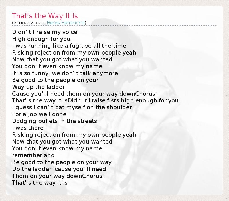Didn' t I raise my voice High enough for you I was running like a fugitive all the time Risking rejection from my own people yeah Now that you got what you wanted You don' t even know my name It' s so funny, we don' t talk anymore Be good to the people on your Way up the ladder Cause you' ll need them on your way downChorus: That' s the way it isDidn' t I raise fists high enough for you I guess I can' t pat myself on the shoulder For a job well done Dodging bullets in the streets I was there Risking rejection from my own people yeah Now that you got what you wanted You don' t even know my name remember and Be good to the people on your way Up the ladder 'cause you' ll need Them on your way downChorus: That' s the way it is