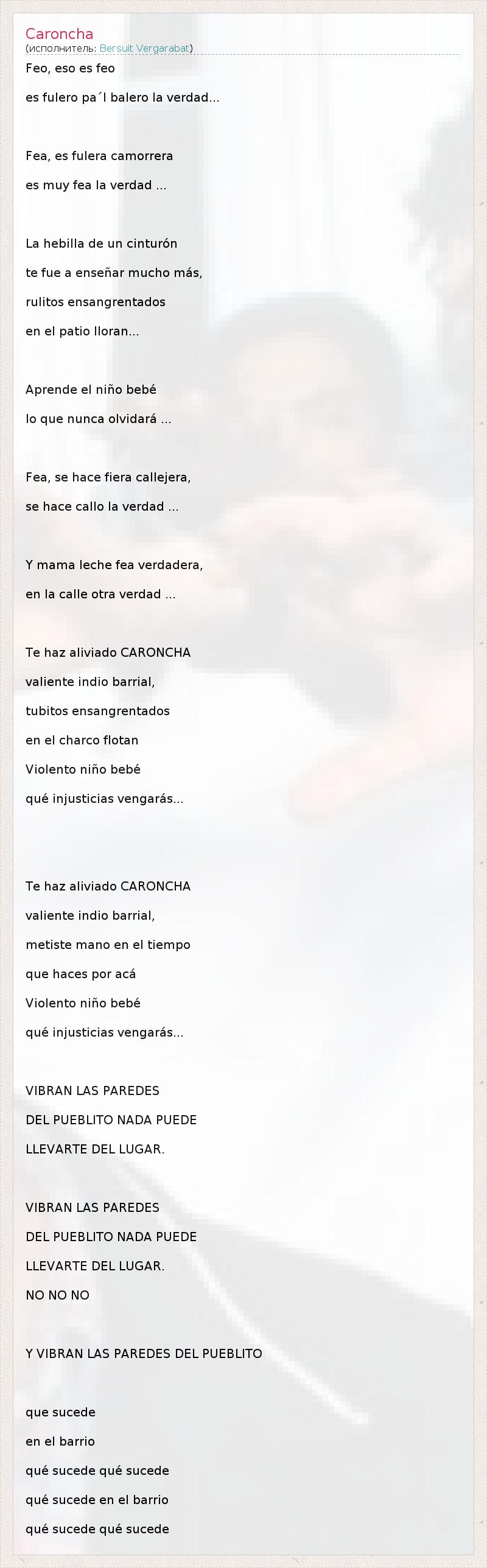 Это интересно:Bersuit Vergarabat, сформировались в 1989 в Аргентине и являются одними из наиболее известных исполнителей латинского рока 90-х.После 2 х андеграундовых альбомов, группа стала смешивать рок с латиноамериканскими ритмами такими как кумбиа(колумбийский народный танец), чакарера(испанский танец), кандомбе(негритянский танец под барабаны) и куртетанзо(тоже латинский... продолжение