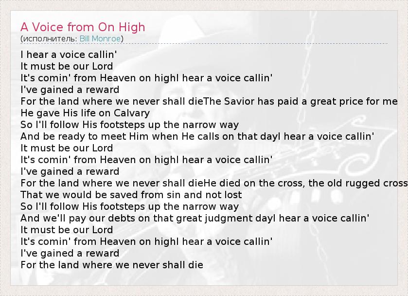 I hear a voice callin' It must be our Lord It's comin' from Heaven on highI hear a voice callin' I've gained a reward For the land where we never shall dieThe Savior has paid a great price for me He gave His life on Calvary So I'll follow His footsteps up the narrow way And be ready to meet Him when He calls on that dayI hear a voice callin' It must be our Lord It's comin' from Heaven on highI hear a voice callin' I've gained a reward For the land where we never shall dieHe died on the cross, the old rugged cross That we would be saved from sin and not lost So I'll follow His footsteps up the narrow way And we'll pay our debts on that great judgment dayI hear a voice callin' It must be our Lord It's comin' from Heaven on highI hear a voice callin' I've gained a reward For the land where we never shall die