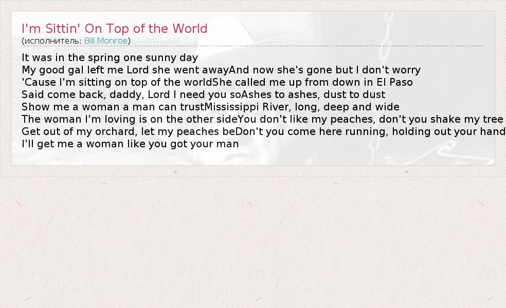 А как ты думаешь, о чем песня "I'm Sittin' On Top of the World" ?