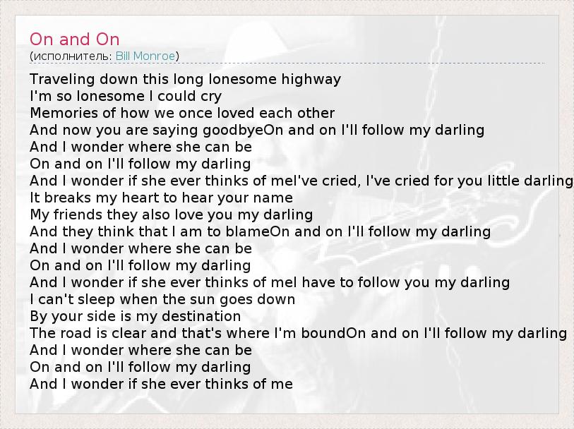Traveling down this long lonesome highway I'm so lonesome I could cry Memories of how we once loved each other And now you are saying goodbyeOn and on I'll follow my darling And I wonder where she can be On and on I'll follow my darling And I wonder if she ever thinks of meI've cried, I've cried for you little darling It breaks my heart to hear your name My friends they also love you my darling And they think that I am to blameOn and on I'll follow my darling And I wonder where she can be On and on I'll follow my darling And I wonder if she ever thinks of meI have to follow you my darling I can't sleep when the sun goes down By your side is my destination The road is clear and that's where I'm boundOn and on I'll follow my darling And I wonder where she can be On and on I'll follow my darling And I wonder if she ever thinks of me