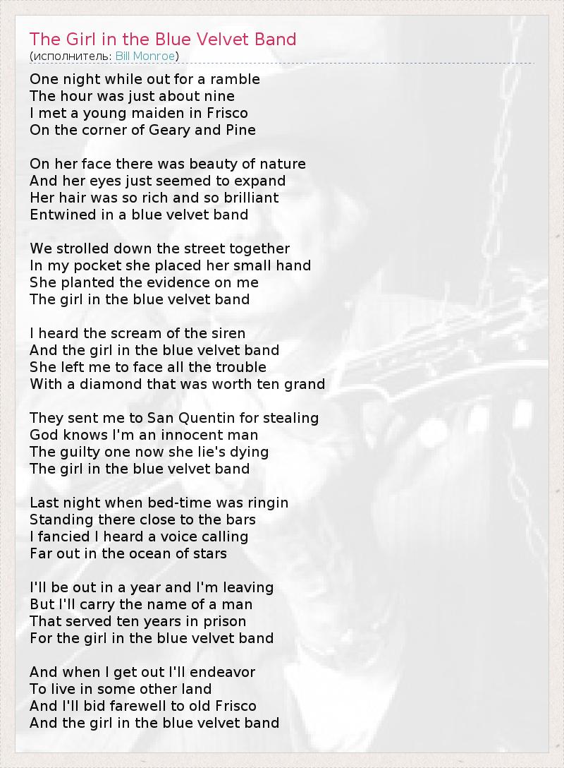 А как ты думаешь, о чем песня "The Girl in the Blue Velvet Band" ?